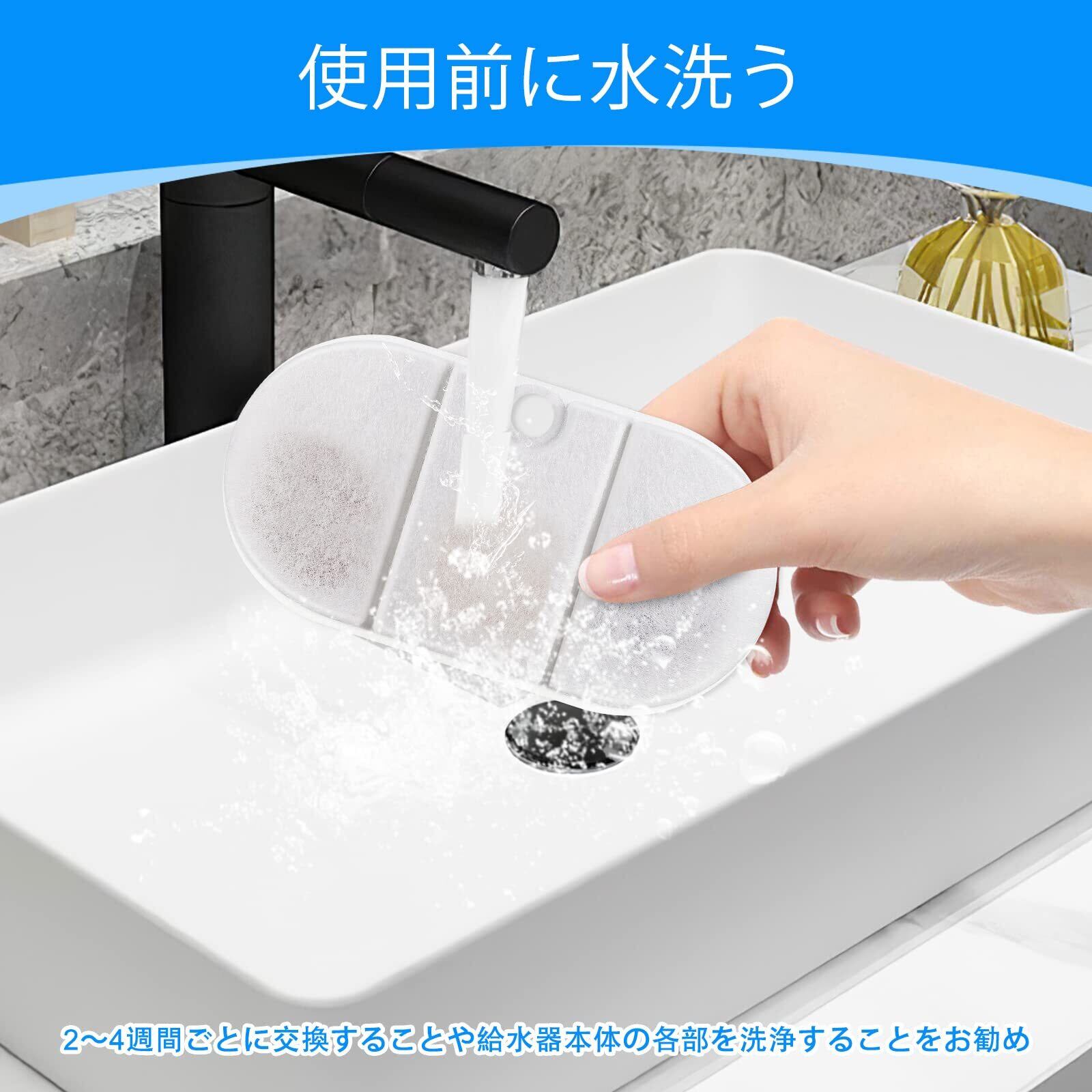 猫 水 フィルター の使う方:フィルターの表面に付着した活性炭を除去するため、猫 フィルター が到着後、2~3分ほど水洗いまたは水に浸けてください。ペット用ウォーターディスペンサーを清潔に保つため、2〜4週間ごとに交換することや給水器本体の各部を洗浄することをお勧めします