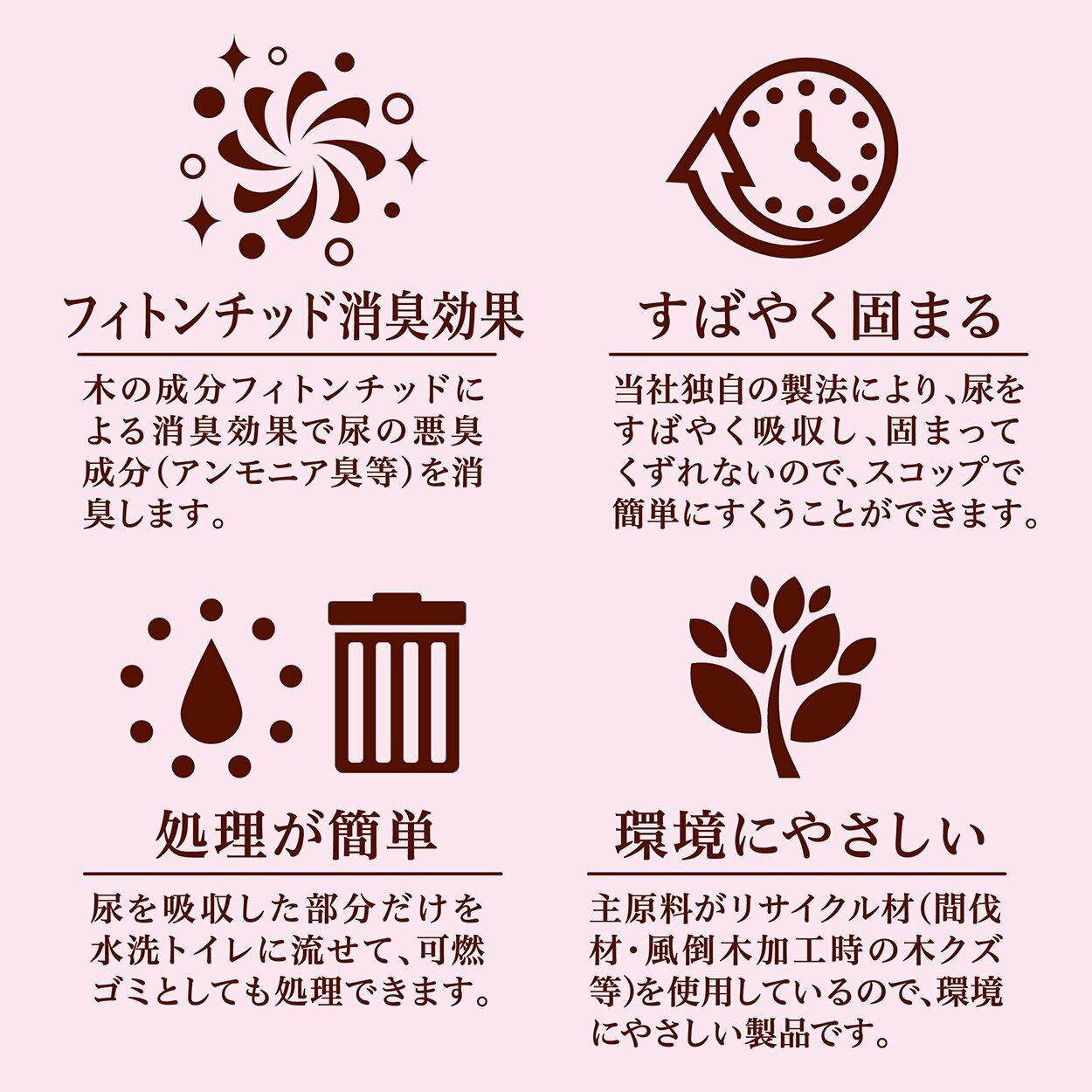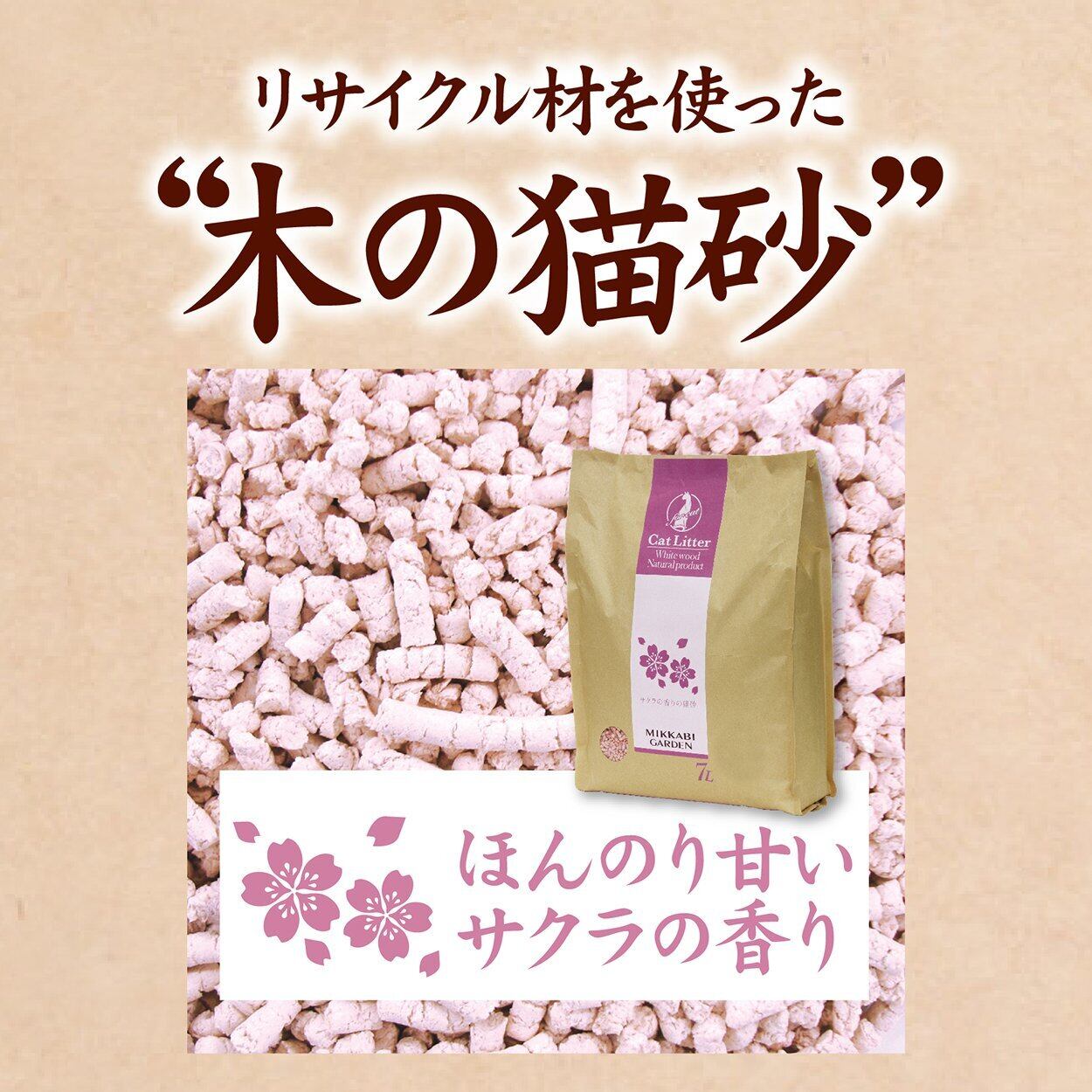 オーナー様に声に寄り添い作られた、"木"の猫砂。リサイクル材使用で地球に優しく、安心で使いやすいから人にも優しい。女性に人気のサクラの香りをご用意しました。猫砂は安心・エコロジーへ室内飼いニオイ対策が重要に。環境にやさしい・フィトンチッド消臭効果・すばやく固まる・処理は簡単。 (トイレに流せて、可燃ゴミとしても処理できます)