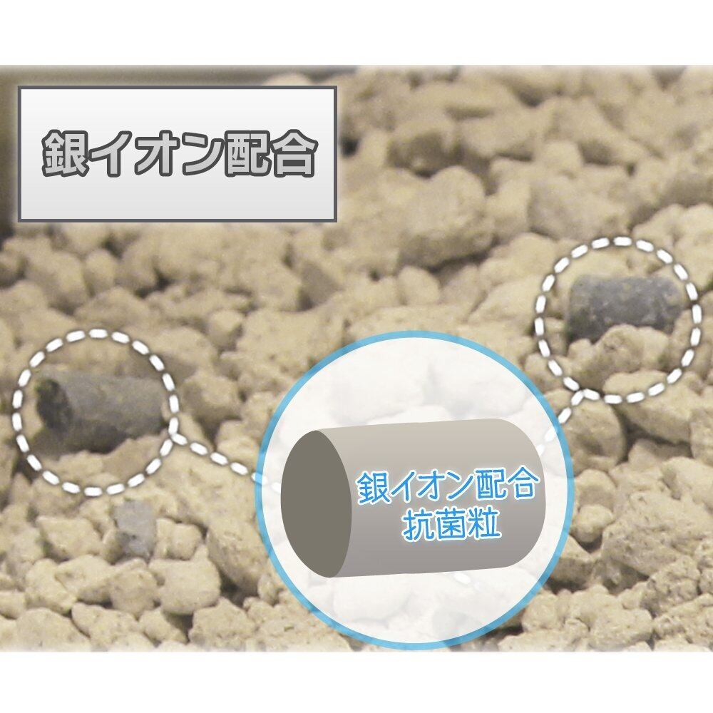 固まる+脱臭の効果に銀イオン粒を配合したベントナイト製の猫砂です。