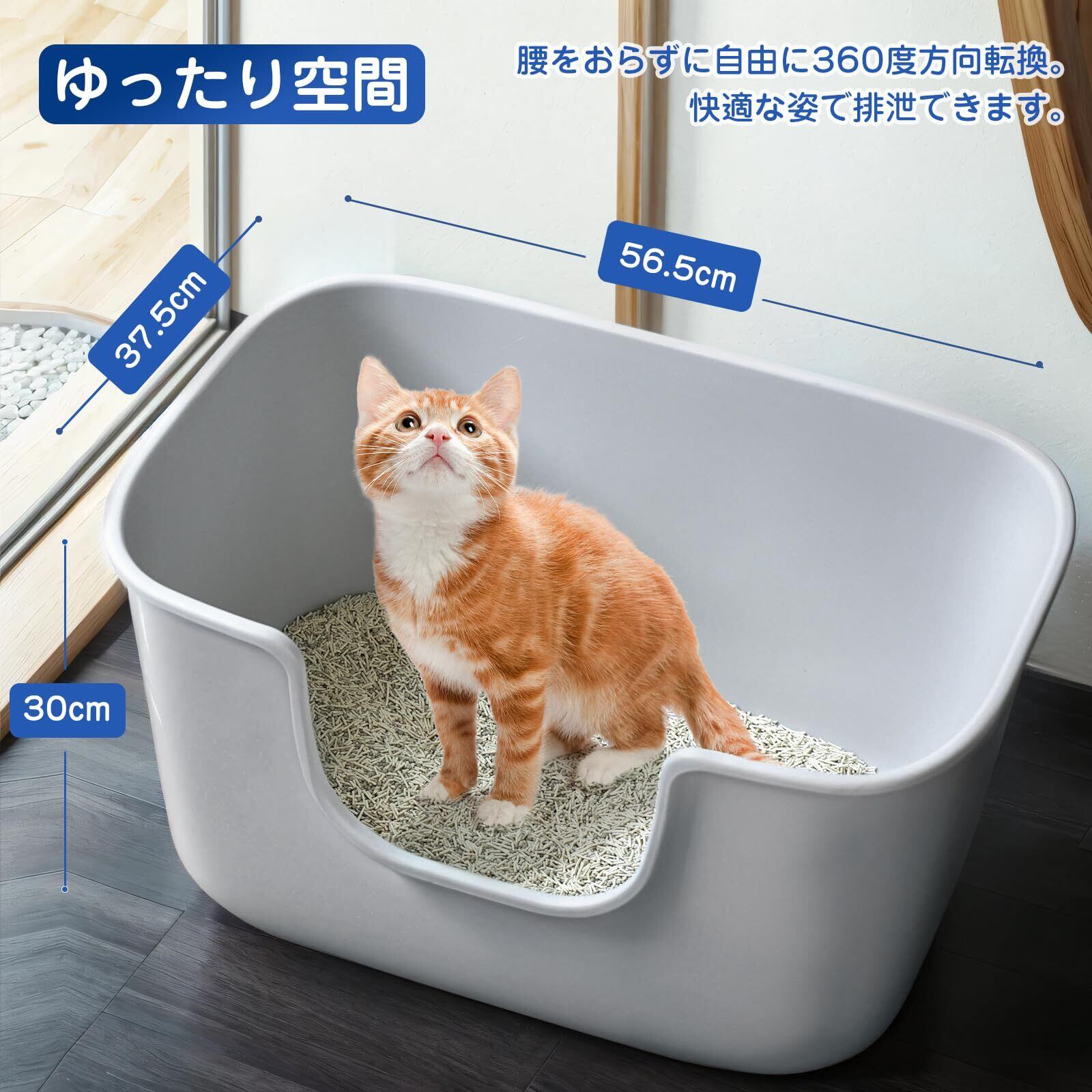太めの猫でもゆったり使用できる大型猫トイレです。サイズ(約):幅56.5×奥37.5×高30cm 猫が出入りしやすいオープンタイプの猫トイレです