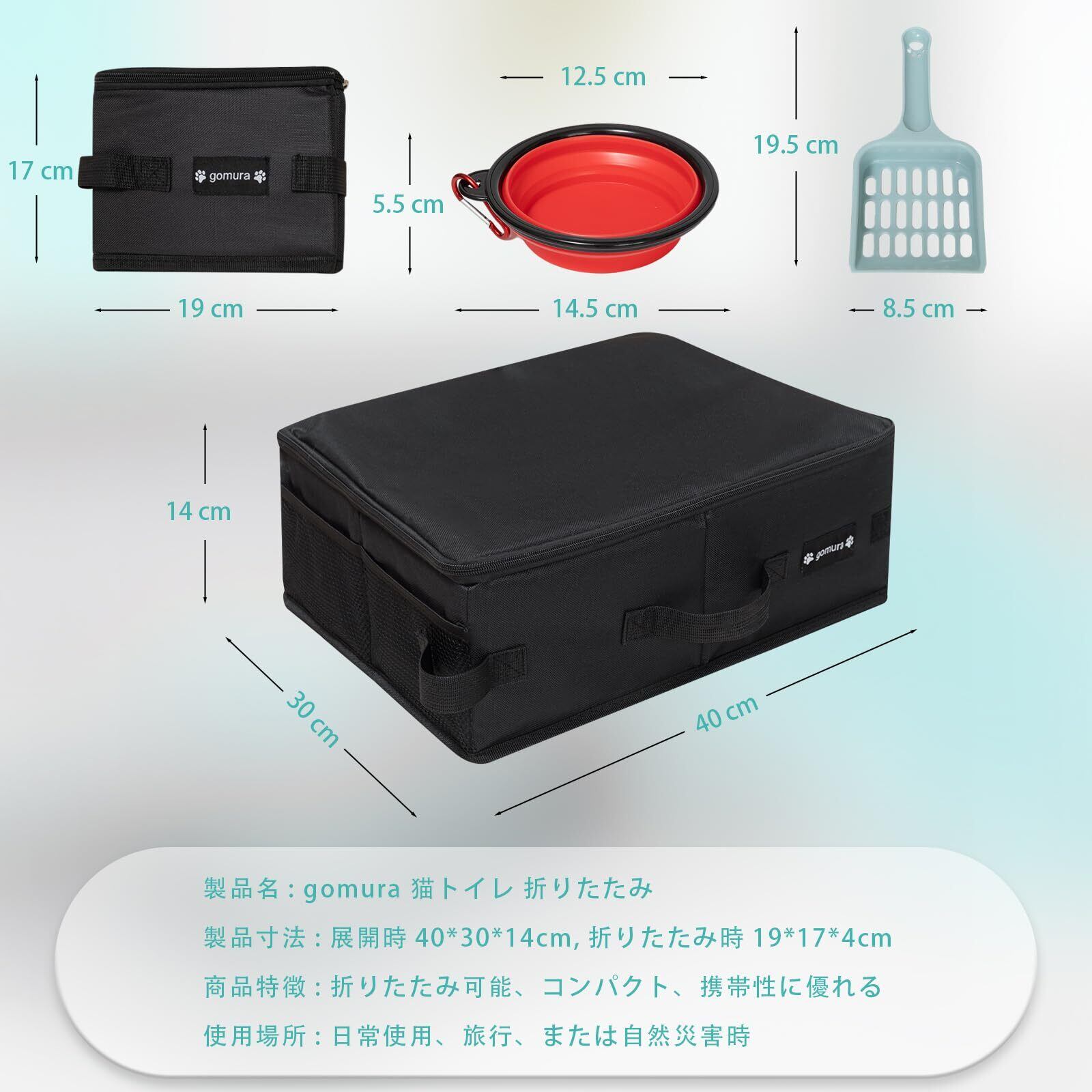 gomura 猫 トイレ 折りたたみ ポータブル ポータブルトイレ トイレスコップ付き 折りたたみ式ボウル付き 撥水 お手入れ簡単 旅行 お出かけ 防災 避難 地震対策 セカンドトイレ (ブラック, M(40*30*15))