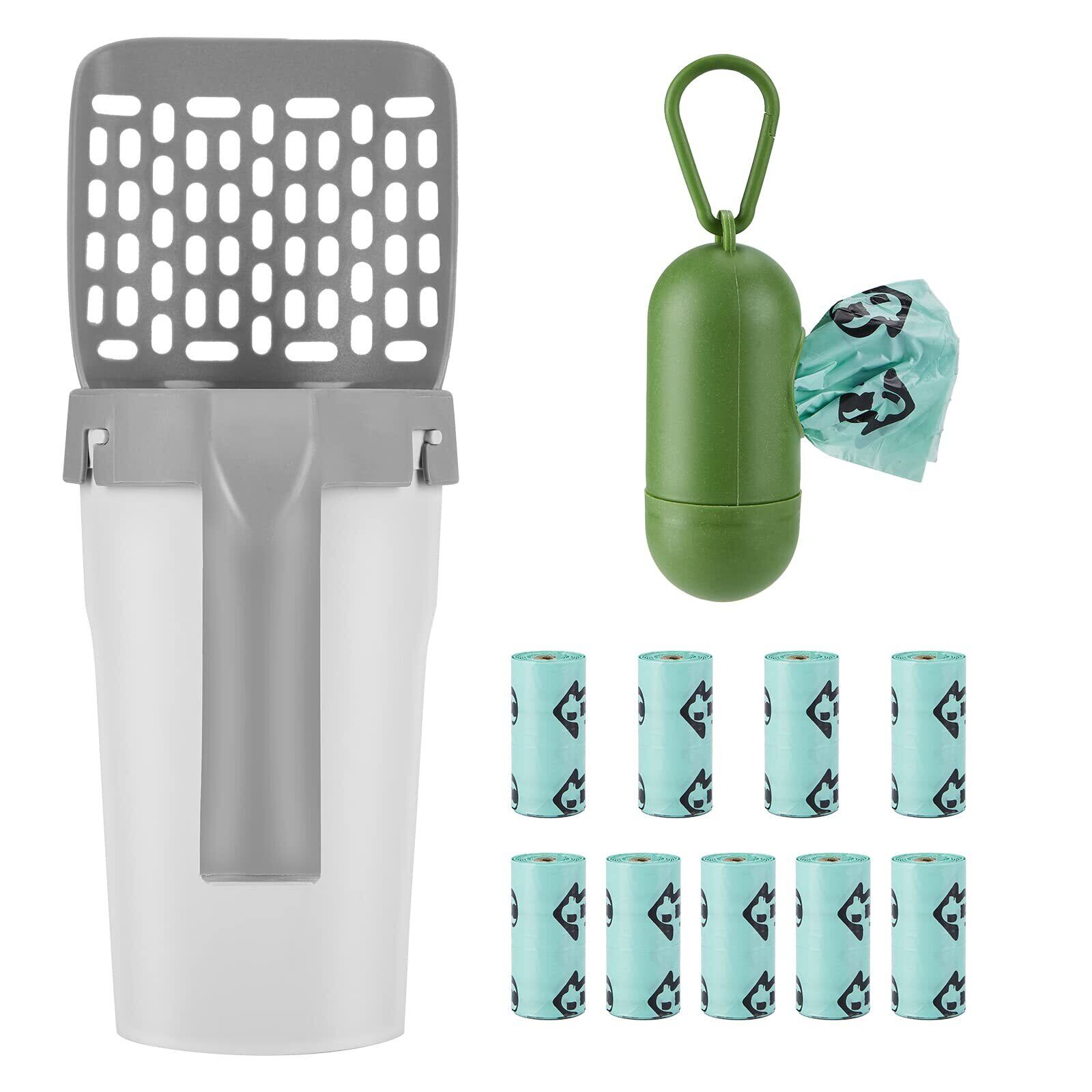 1[ホルダー付き2 IN 1スコップ]猫砂スコップ+猫砂入れ+ゴミ袋の組み合わせユニークなデザインです。掃除と回収が一体となり、シンプルなスコップだけでなく、追加の袋も付いて、片手でペットのウンチを掃除でき、便利で毎日の掃除に適しています。