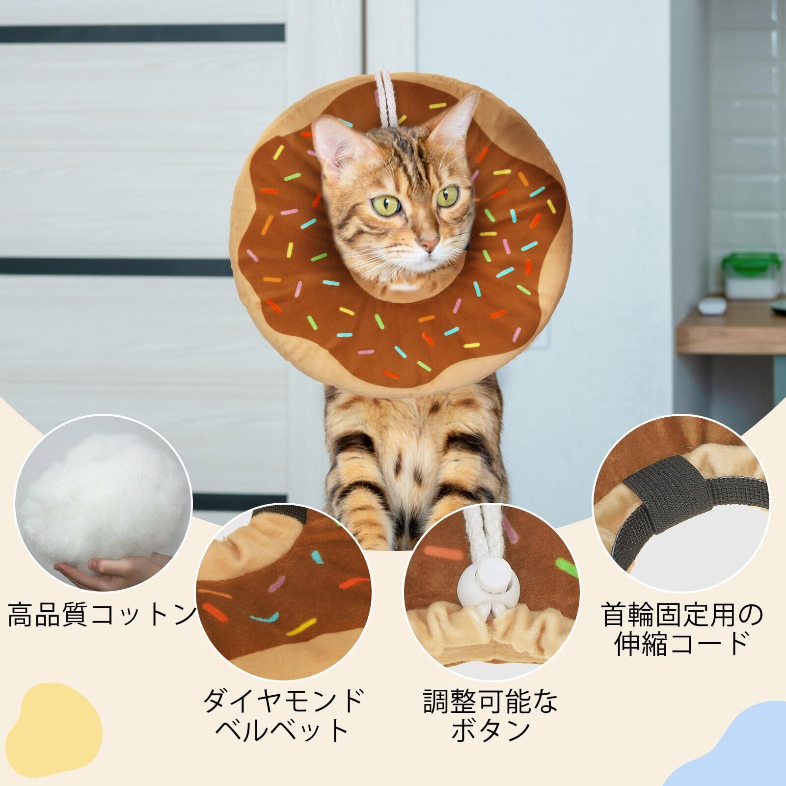 【軽量&柔らかコットン素材】中綿入りの軽量PPコットン素材で首への負担が少なく、敏感な肌にもやさしい。ペットの快適性を考えた、ふんわり柔らか設計。簡単に脱がれないよう、装着後は紐をしっかり結んでください。