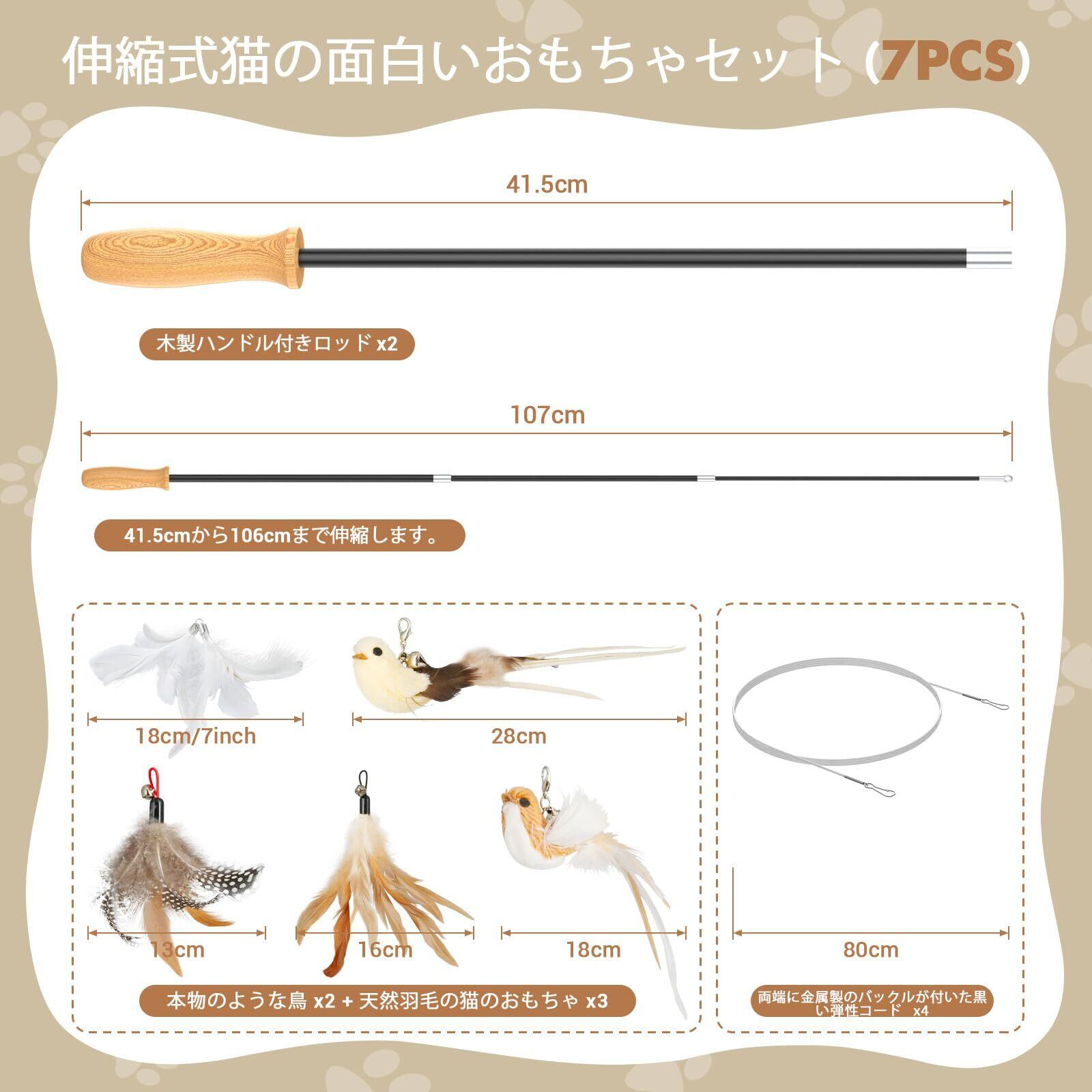 【ROSAUI】猫じゃらし 2本セット 伸縮式107cm 木製ハンドル 羽根おもちゃ3種&鳥型2個付き 交換ヘッド対応 猫用おもちゃ 運動不足解消 多頭飼い適用 コンパクト収納 ブラックゴム紐4本付き