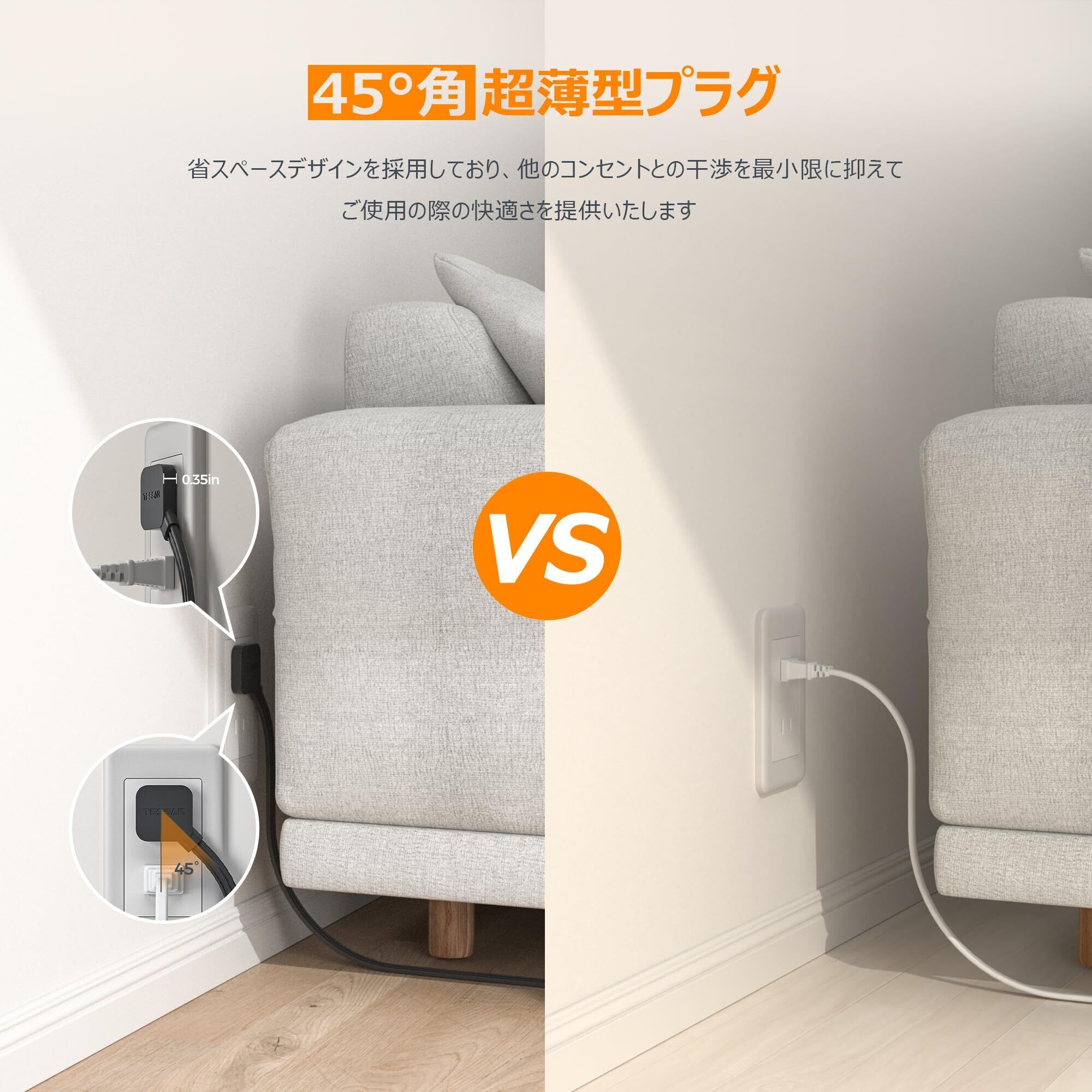 【狭い場所対応延長コード】超薄型プラグと薄型延長コードを採用し、壁際配置にした家具に隠れてしまったコンセントからも電源が取り易いです。