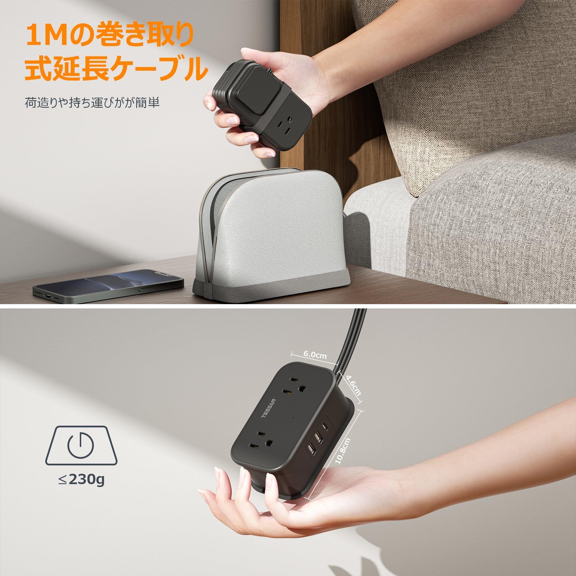 延長コード 短い 1m 電源タップ type-C付き コンセント 薄型 ブラック TESSAN タコ足配線 テーブルタップ 4個口 1タイプCと2タイプAポート 出張/旅行用 2ピン/3ピン適用 黒