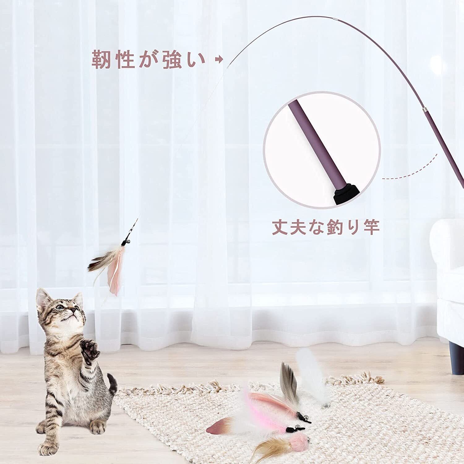伸縮可能な釣り竿:このじゃらしは竿を伸縮させることができます。そのため部屋のサイズや飼っている猫に合わせて竿の長さを調整することが可能です。