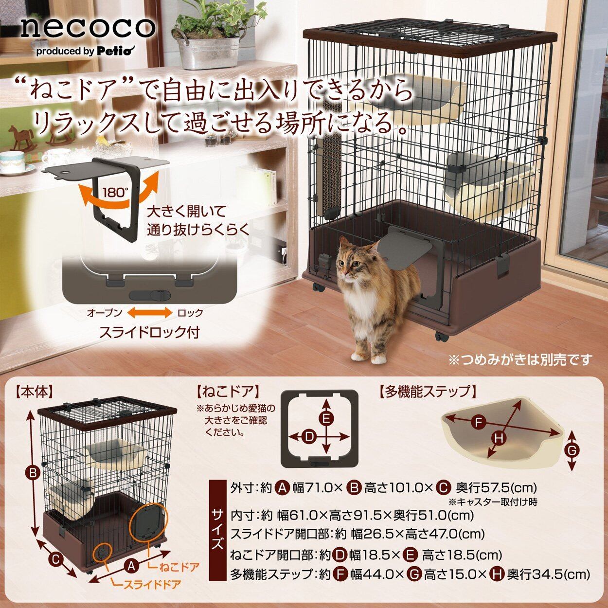人と猫 お互いにくつろぎ、心地よい場所になることをお手伝いする「necoco(ネココ)」。ねこドアで自由に出入りでき、しつけにもぴったりなキャットルームサークル。多機能ステップはトイレ・隠れ家・ベッドと用途に合わせて使い分け可能。つめみがきホルダー付。