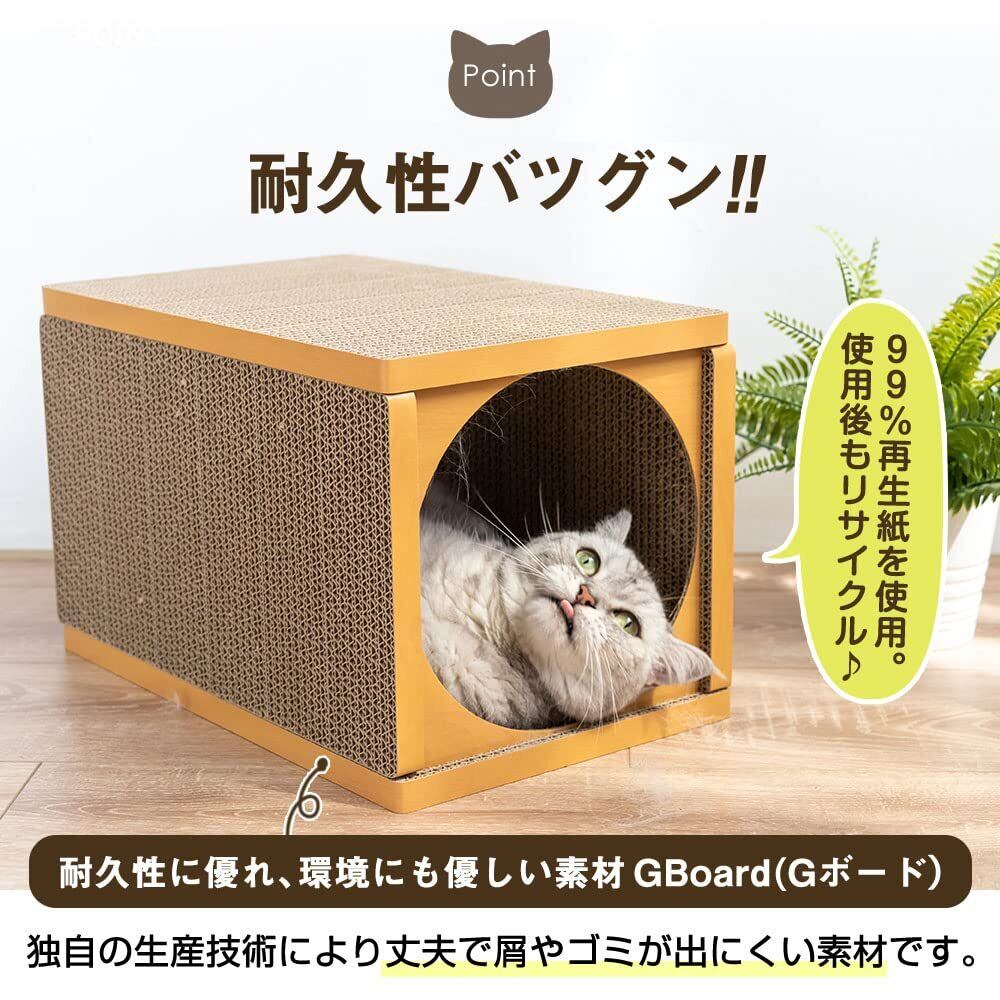 耐久性に優れ、GBoardと呼ぶフラットで強力な紙パネルで作られている、つめとぎ付きキャットハウス。 壁面には爪とぎがあり、愛猫ちゃんが喜びます。 猫ちゃんは狭い所が大好き(=^・・^=) 猫ちゃんのくつろぎのお部屋になります。 リサイクル紙で作られており環境にやさしく、処分も簡単で費用が掛かりません。 見た目もシンプルで、どんなインテリアにもマッチします。