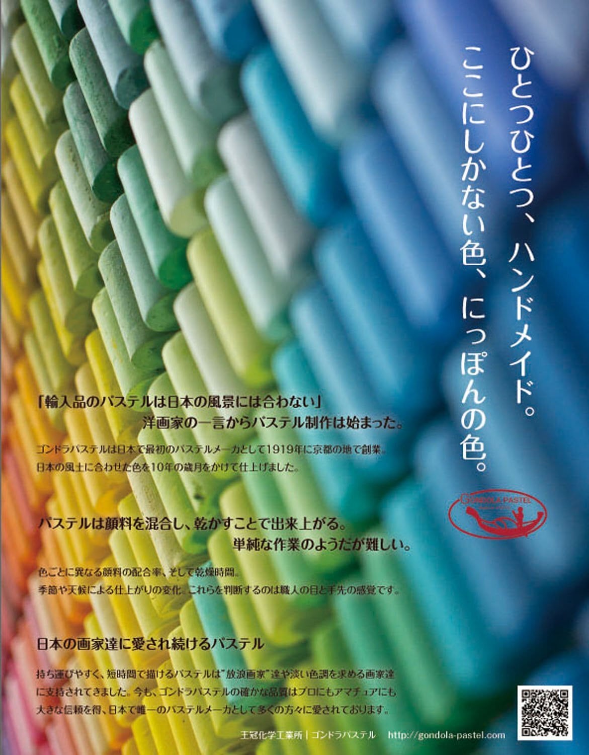 日本で最初のソフトパステルメーカー、ゴンドラパステルは、独自の配色でセットを組み、日本人的色調で力強さと量感のある表現を可能にしました。また、最高水準のパステルとして厳しい品質管理のもと、手作りで生産されていますので、プロ・アマを問わず、自信を持っておすすめします。
