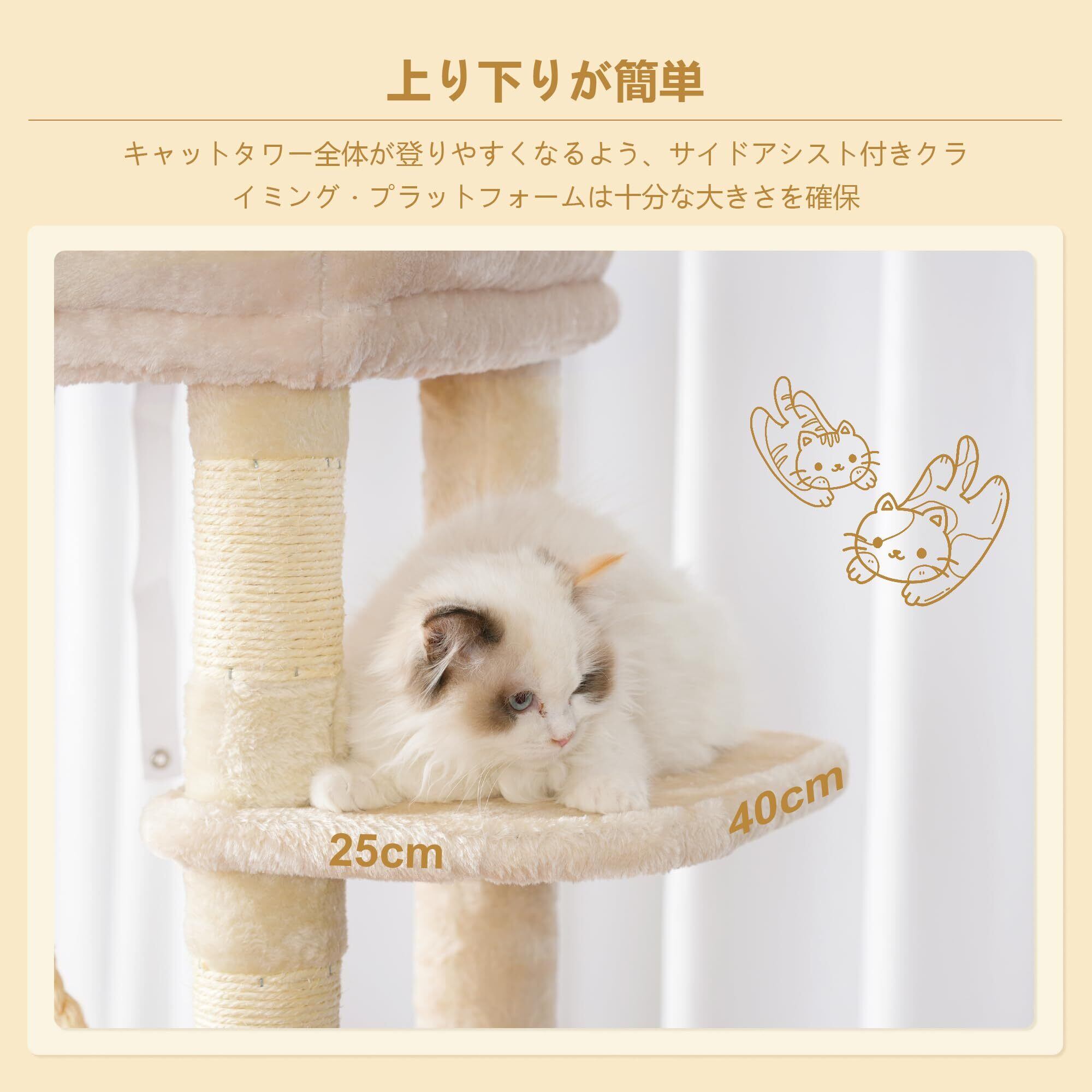 【安定性】厚みのある底板と、転倒防止装置を併用しており、キャットツリー全体が安定しています。4本の柱で支えられている見晴らし台とハンモックは、1本の柱で支えられている猫用ベッドよりも安定性が高まります。