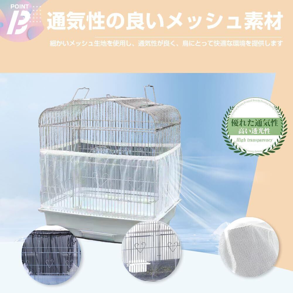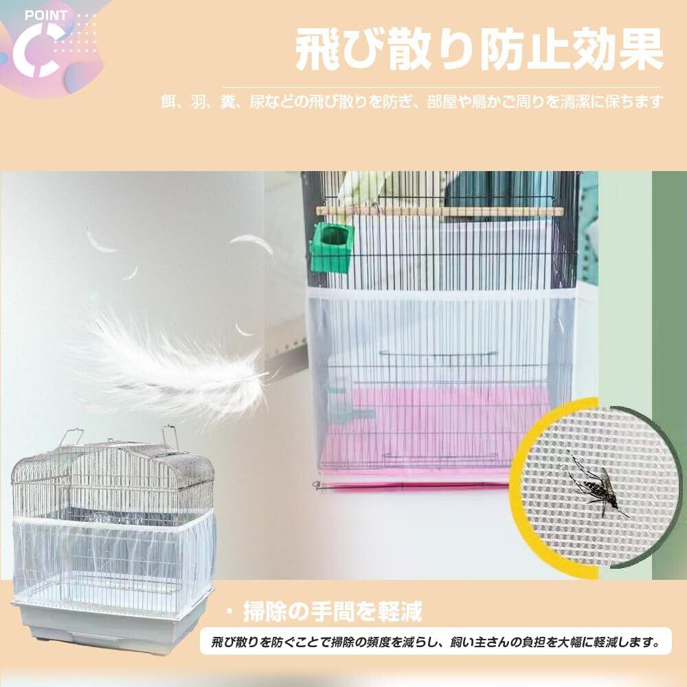 3. 清潔さを保つ機能性 餌、羽、糞、尿などの飛び散りを防ぎ、部屋や鳥かご周りを清潔に保つ効果があります。掃除の手間を大幅に軽減する飼い主さん必見のアイテムです。