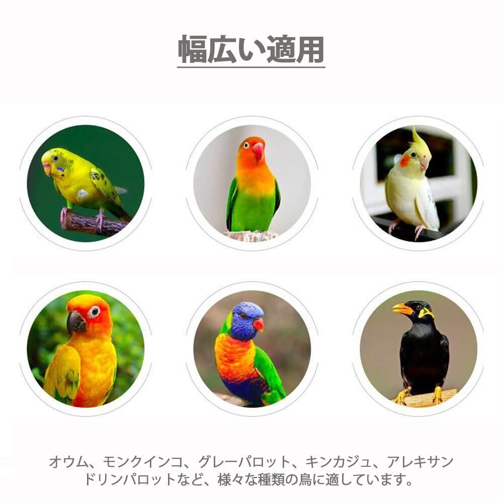 【幅広い適用】オウム、モンクインコ、グレーパロット、キンカジュ、アレキサンドリンパロットなど、様々な種類の鳥に適しています。