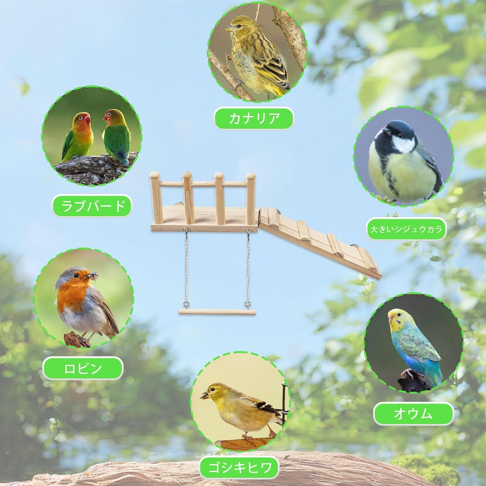 【パッケージ】3点セット。はしご+ブランコ+止まり木。 【安全な素材】天然木で作られ、安全で環境に優しく、無毒で鳥に無害です。表面は滑らかで耐久性があるので、ペットの健康やおもちゃが噛まれて損傷する心配はありません。 【登るおもちゃ】この鳥のおもちゃははしご、ブランコ、止まり木の3つの部分で構成されており、鳥が遊ぶ場所を提供します。登ったり、ぶらぶらしたり、遊んだり、休んだりすることができ、効果的にストレスを軽減でき、オウムにとって最適なおもちゃです。 【取り付け簡単】鳥止まり木とはしごには2つの鉄片が付属しており、鳥かごの内側と外側の鉄片を固定するだけで完成します。ブランコにはフックが付属しており、止まり木に吊り下げて組み立てることができます。安定感が良く、倒れる心配もありません。 【適用対象】オウム、インコ、セキセイインコ、オカメインコ、コザクラインコ、カナリア 、文鳥、牡丹などの種類の鳥に最適です。