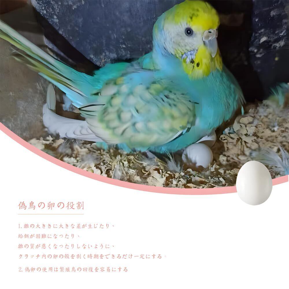 【偽卵を使用する理由】産卵時間をできるだけ一定に調整するため、卵の大きさに差が出すぎるのを避けるため、給餌に苦労するのを避けるため、質の悪いヒナを避けるため、ブリーダーを休ませるために偽卵を使用するため。