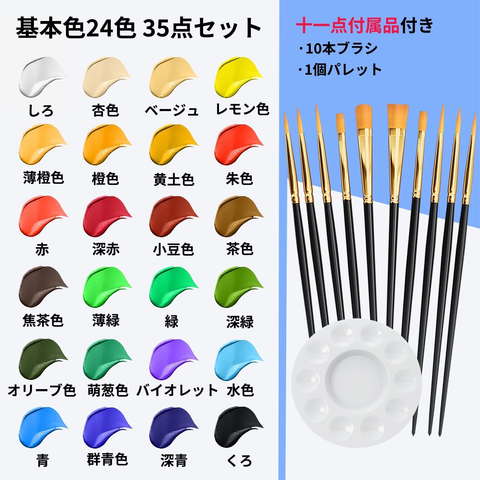 35点セット アクリル絵の具 24色 アクリルガッシュ 10本ブラシ&1個パレット付き チューブ 耐久性 速乾 防水 手作り 手軽 木/卵/陶器/布に描ける 子供用 イラスト 塗り絵 クラフト 絵具セット 美術 画材 宿題 初心者 専門家 入園・入学お祝い プレゼント