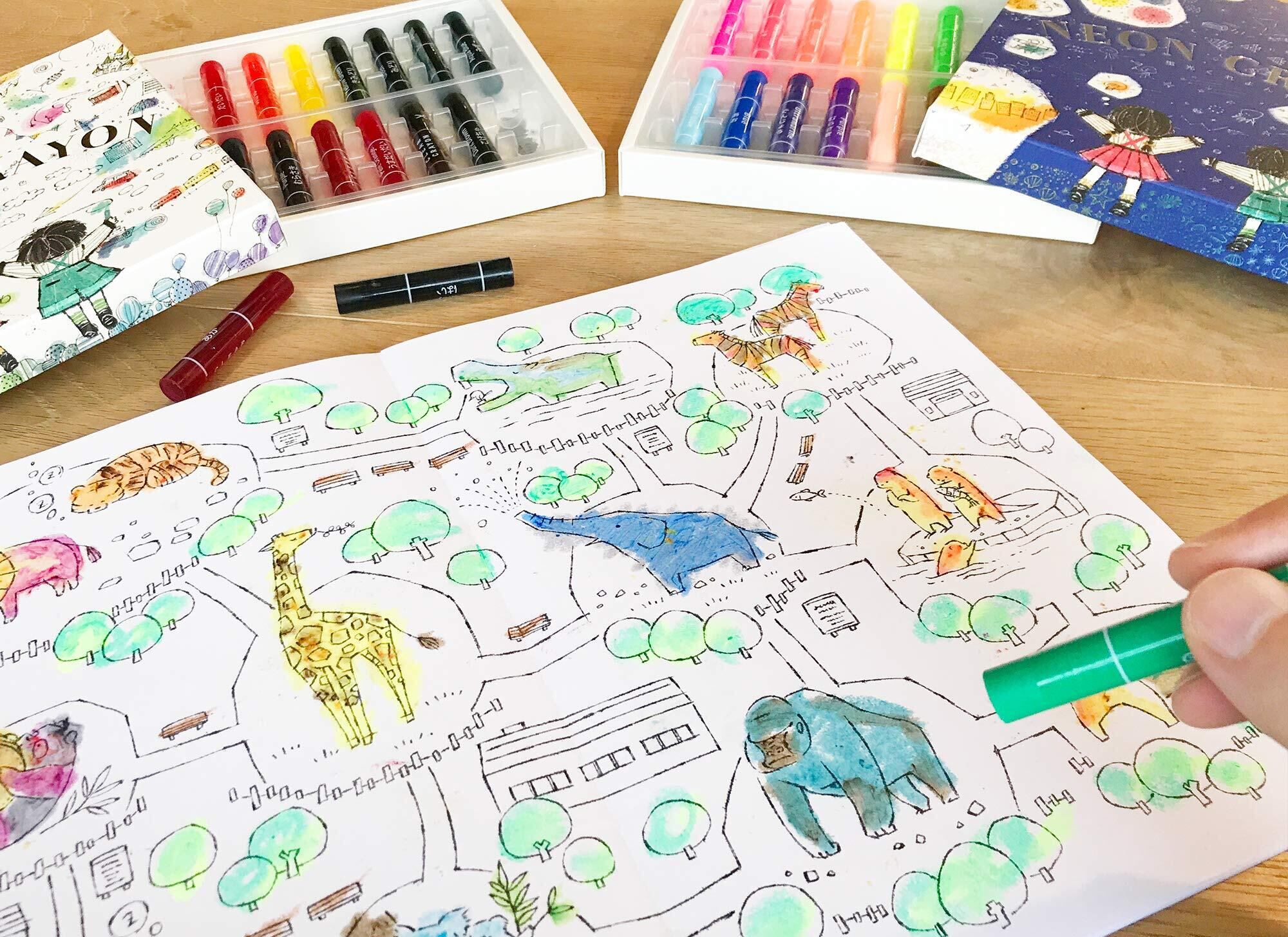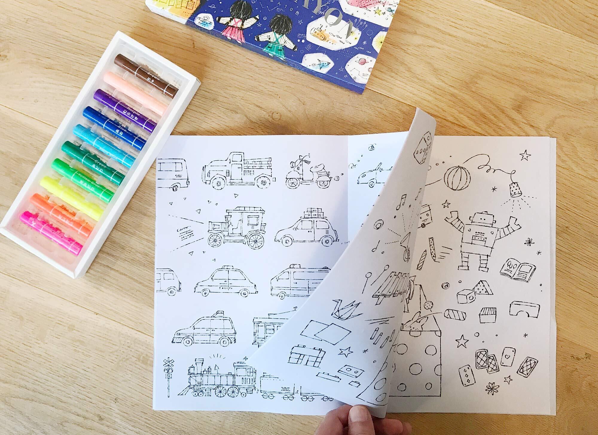 中紙に厚手の画用紙を採用しており、クレヨンや色鉛筆のほか、水彩えのぐや水性ペンも使用可能です。