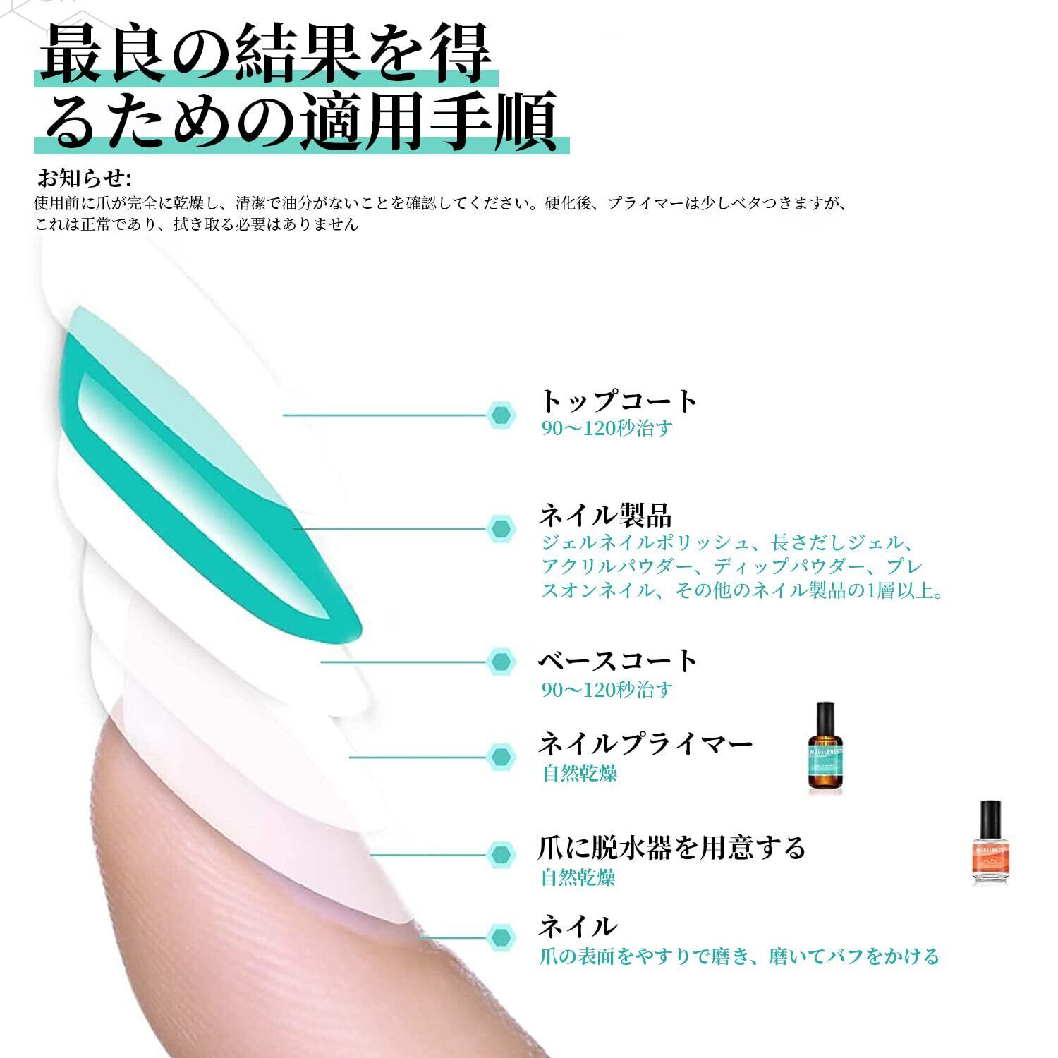 塗り方:透明なボトルはネイルデハイドレーで、アクリルやジェルポリッシュを塗る前に爪を脱水します。茶色のボトルはネイルプライマーで、爪とジェルポリッシュを接着します