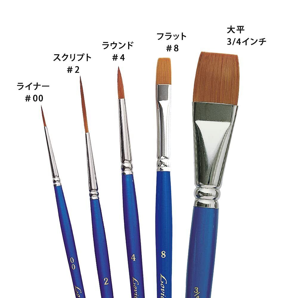 良く使用される筆のセットになります。大平3/4インチ、フラット#8、ラウンド#4、スクリプト#2、ライナー#00のセットです。