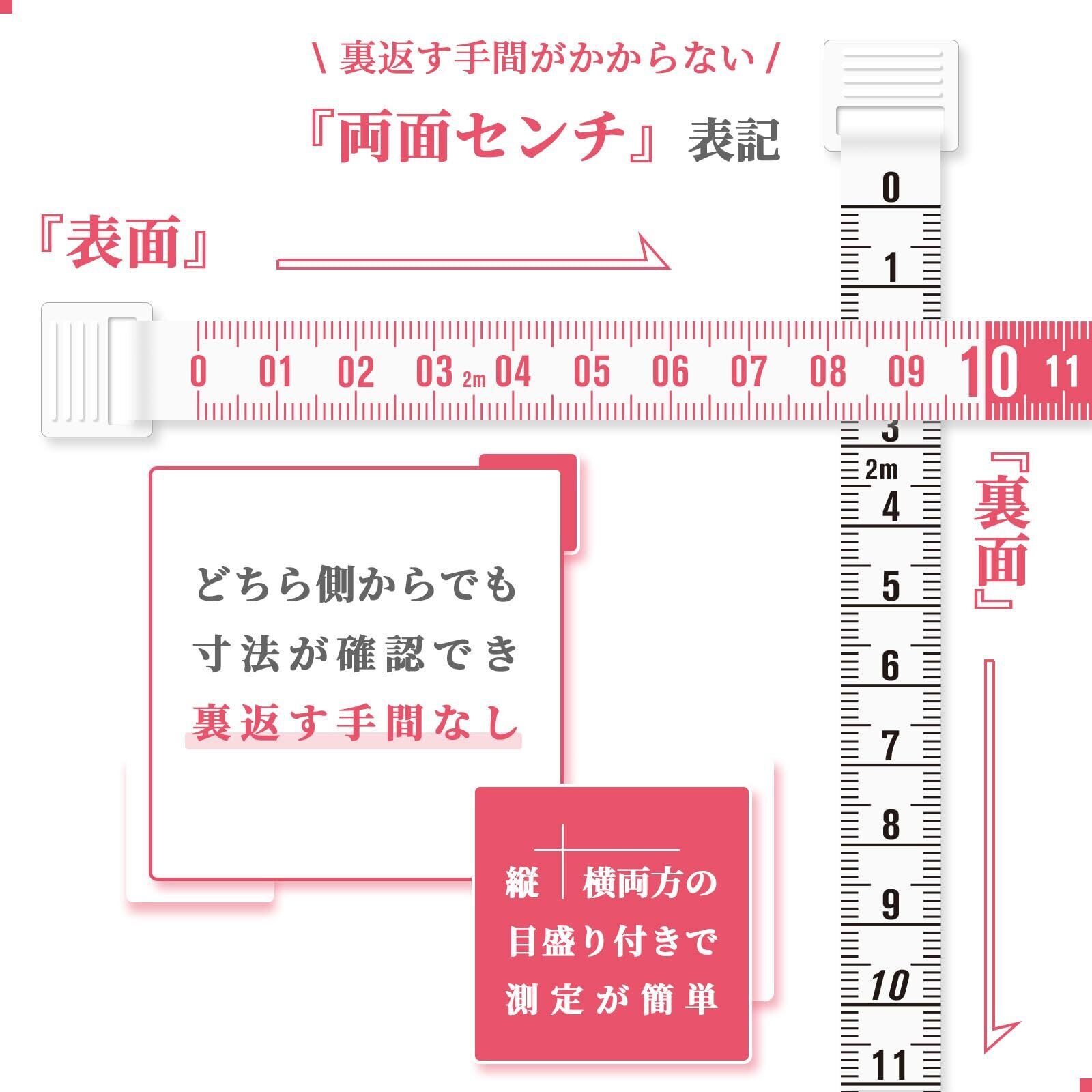 【両面センチ・2mまで測れる】両面がセンチ表記なので、どちら側からでも寸法がすぐに確認でき、従来の片面がインチ表記のめじゃーのように裏返す手間がかかりません