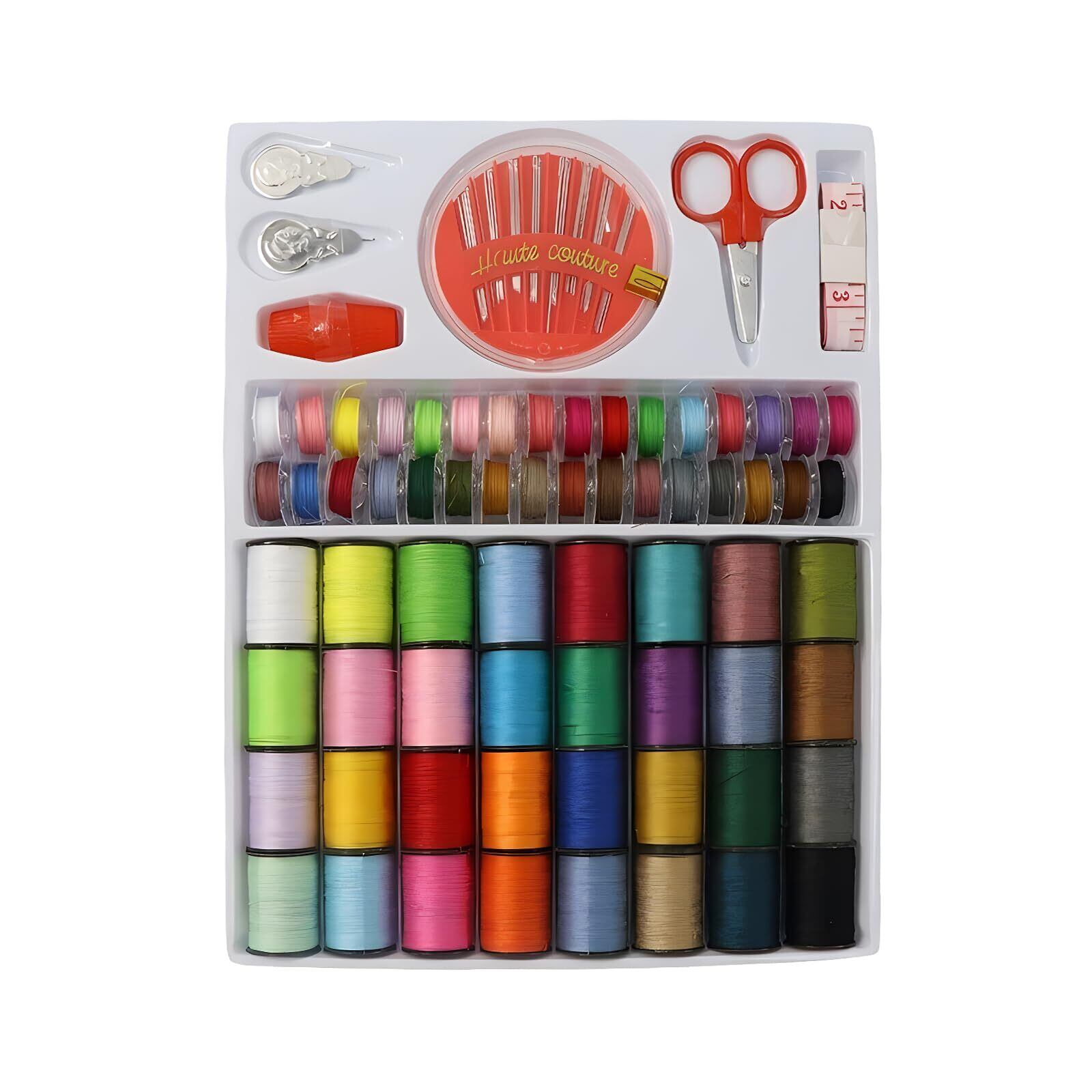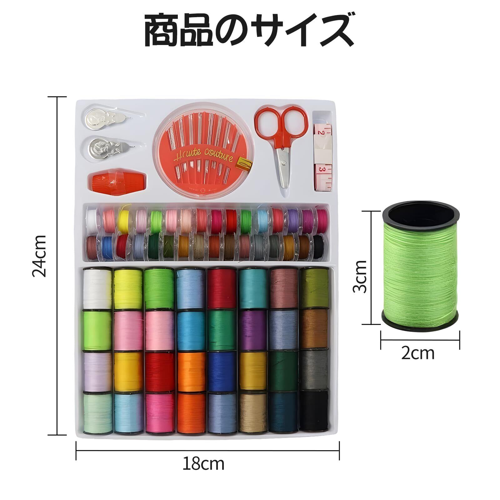 【パッケージ】ミシン糸32本、普通糸32本、はさみ1組、巻き尺1本、針1組、指ぬき1本、糸通し1本、糸切り1本が入った多機能便利なソーイングキットです。 初心者や手芸愛好家に最適!
