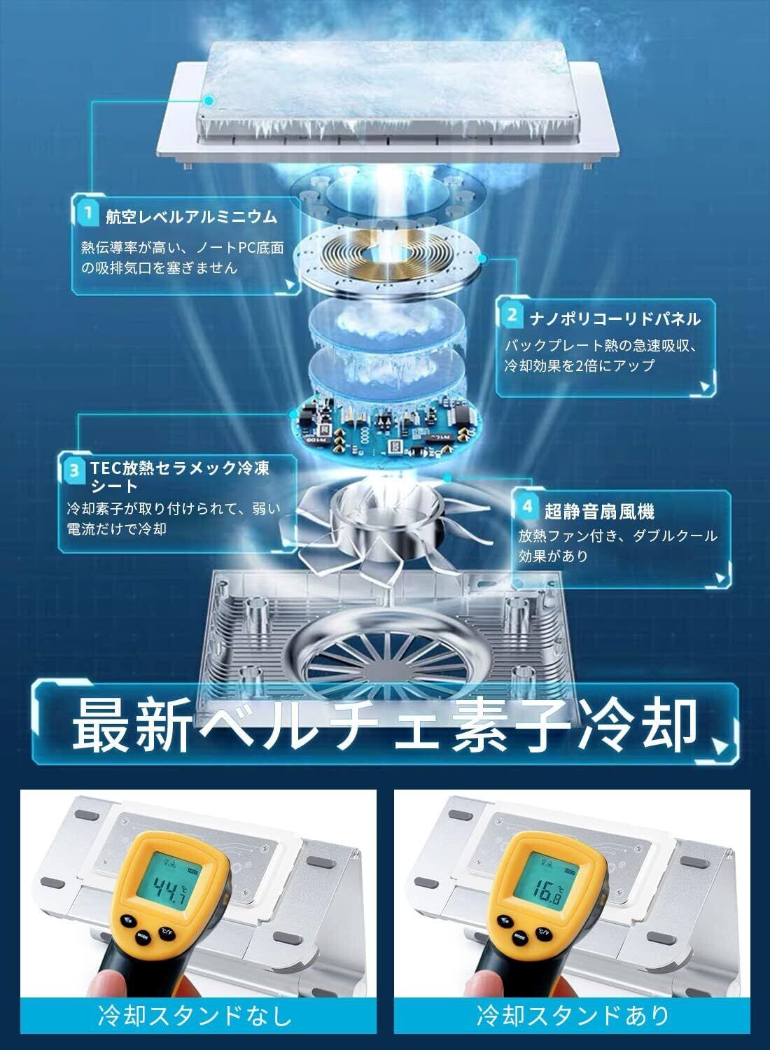 ❄【ベルチェ素子冷却・3秒で瞬間冷却】ノートPCクーラー は半導体ベルチェ素子冷却技術を採用しており、冷却シートが急速に冷えて、シート部分をノートパソコンへ直接当てて冷やします。ノートPCの熱を一瞬でぶっ飛ばします!15°までの冷却も可能!冷却クーラーは合計6つの位置に調整可能。ご使用のノートPCの吸気口・排気口を塞がず、快適に使用できる!長時間の使用や夏場にノートPC/スマホの熱暴走対策として大活躍!コンピュータCPU温度を効果的に抑え、熱によるPCの故障を改善することでPCの寿命を伸ばします。