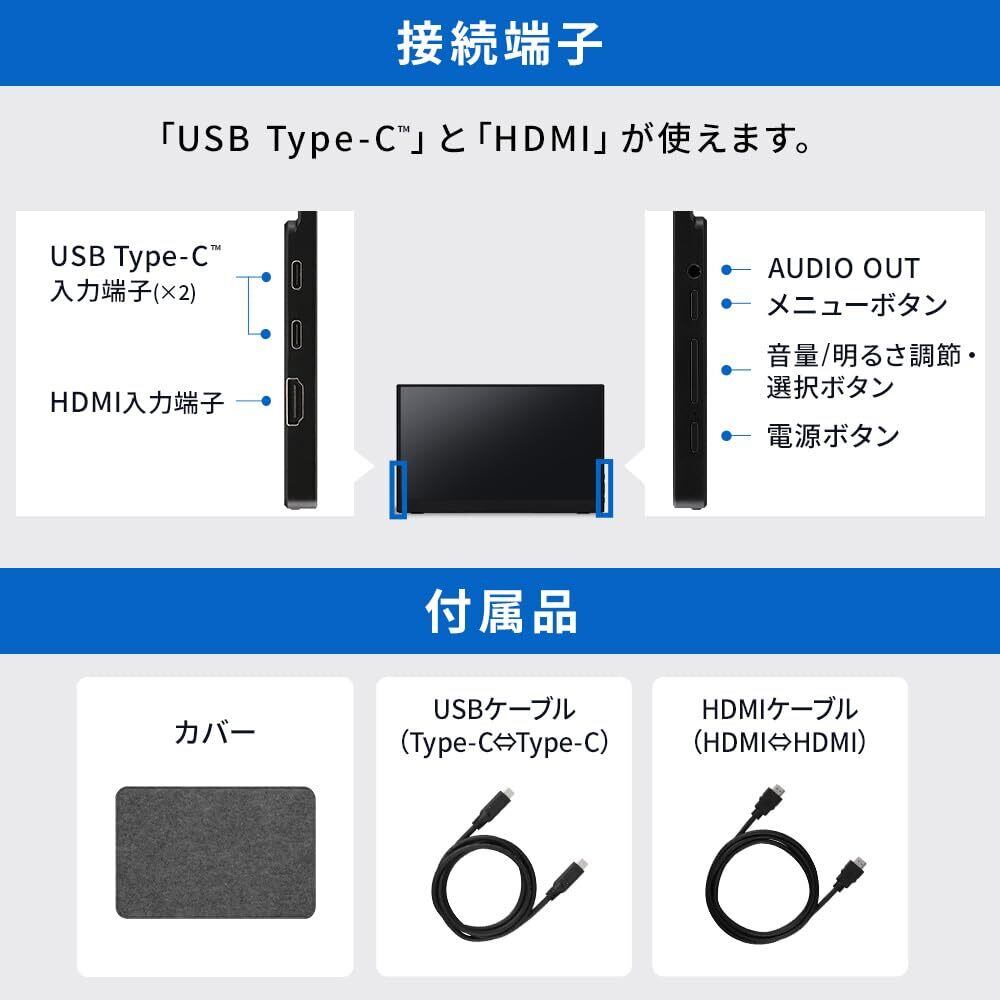 仕事で大活躍!テレワークや出張に便利なわらない忠実ポータブルモニターです。豊かな階調表現で、ありのままの色を再現。最大表示色1619万色。角度が変わっても、ほぼ色味が変な色再現。映像の発色もやわらかく、目にやさしい非光沢タイプ。●商品サイズ(cm)幅約35.4×奥行約1.1×高さ約22.0●インチサイズ15.6インチ●商品質量約700g●表面処理非光沢●解像度1920×1080●アスペクト比16:9 ●表示色1677万色●コントラスト比1000:1●最大輝度250cd/m2●リフレッシュレート60Hz●応答速度(GtG,typ)20ms●最大消費電力10W●定格電圧/定格電流5V-3A/9V-3A/12V-2.5A/15V-2A/20V-1.5A●スタンバイ消費電力0.5W●入力端子USB Type-C×2 HDMI×1 AUDIO OUT×1●スピーカー出力1W×2●使用温度条件5℃~40℃●使用湿度条件20~85%, 結露しづらいタイプ●付属品・HDMI-HDMIケーブル x 1本・TypeC-TypeC ケーブル x 1本・クリーニングクロス x 1枚・取扱説明書(簡易版) x 1部・カバーx1