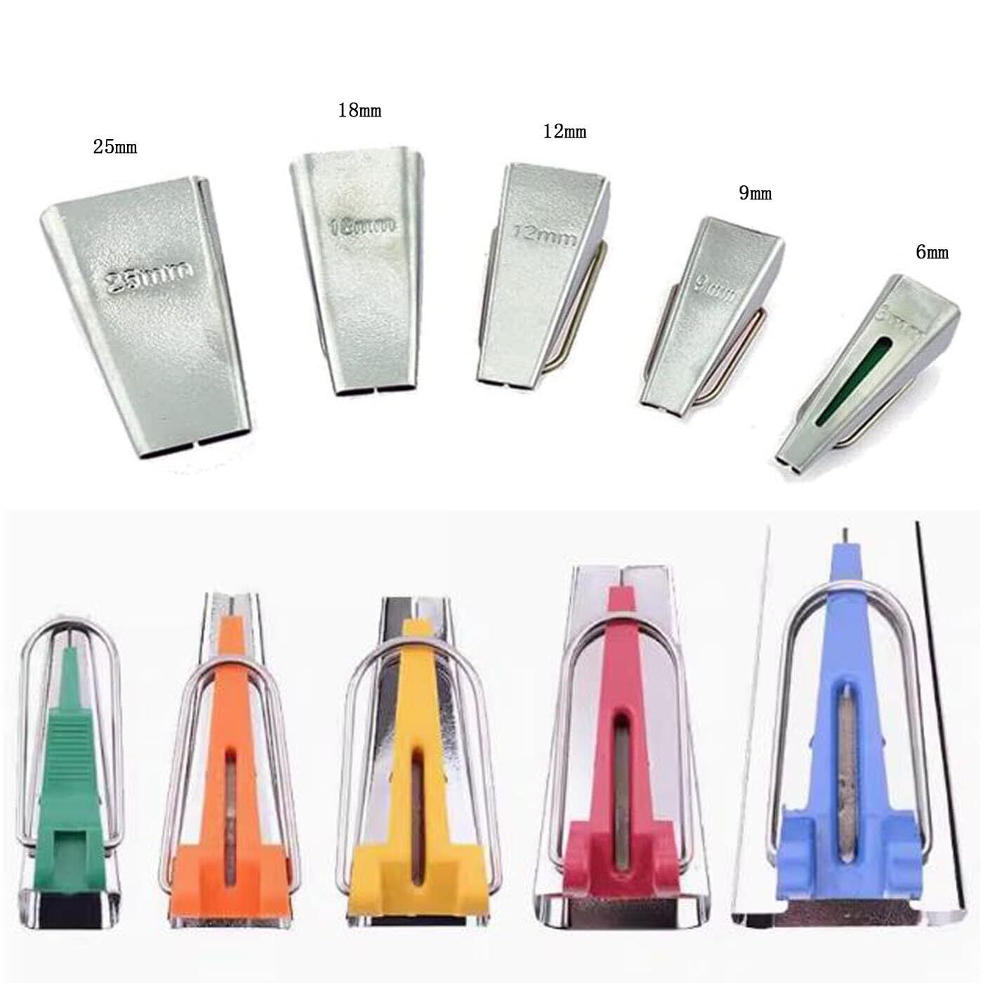 2.マルチサイズ選択、異なる需要を満たす、さまざまな縫製アイテムや生地処理に適した5種類の幅(6 mm、9 mm、12 mm、18 mm、25 mm)のテープ選択を提供します。細かい縁取りでも幅広の生地処理でも、適切なサイズを見つけることができます。