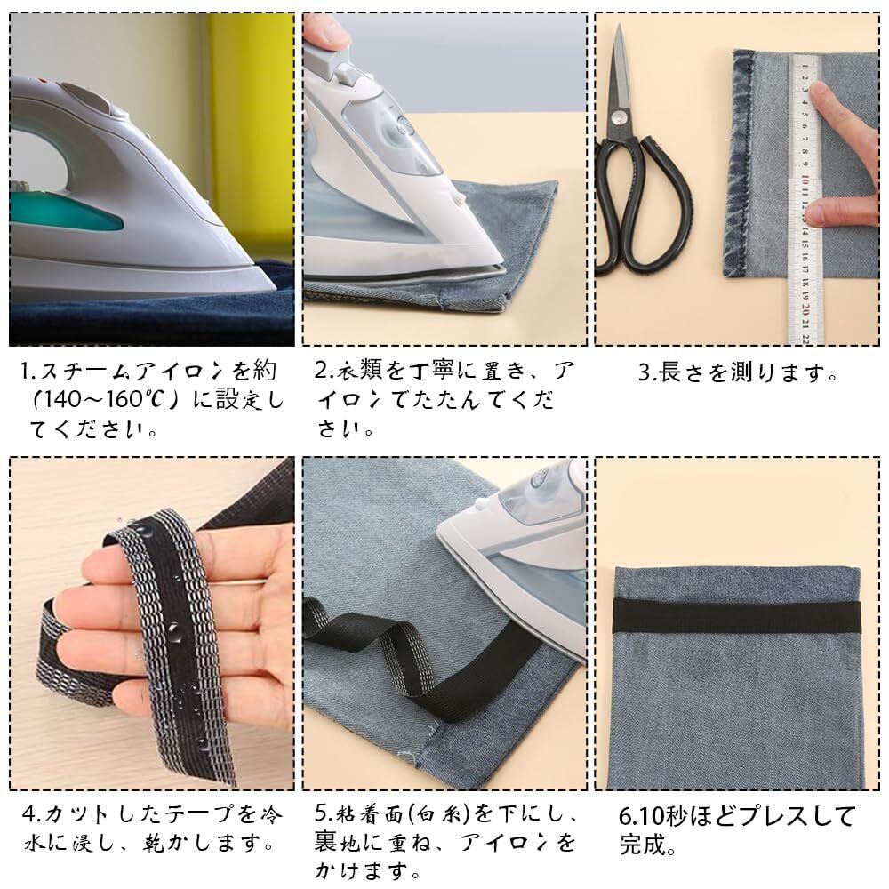 【使用方法】温めるだけで接着剤が生地にしっかりと浸透し、しっかりと接着します。服を所定の位置に配置したら、長さを測り、カットしたテープを生地の間に挟みます。接着剤がしっかりと固定されるよう、接着剤を塗布した後は10秒ほど強く押して、その後1日放置してください。