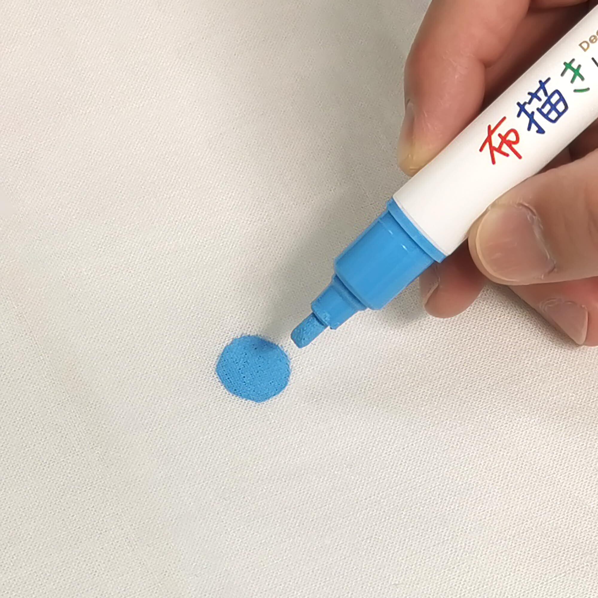 ご家庭で洗濯できる水性顔料布用マーカーです。 有害な有機溶剤を使用していないので、安心してお使いいただけます。 隠蔽性が高いので、濃色布に直接描いても発色がきれいです。 重ね塗りをすると下の色を隠す性質があります。 その際は最初に塗った色がしっかり乾いたことを確認してから塗ってください。 細線を表現する際は、別売の「布描きしましょ用替えペン先」がオススメです。