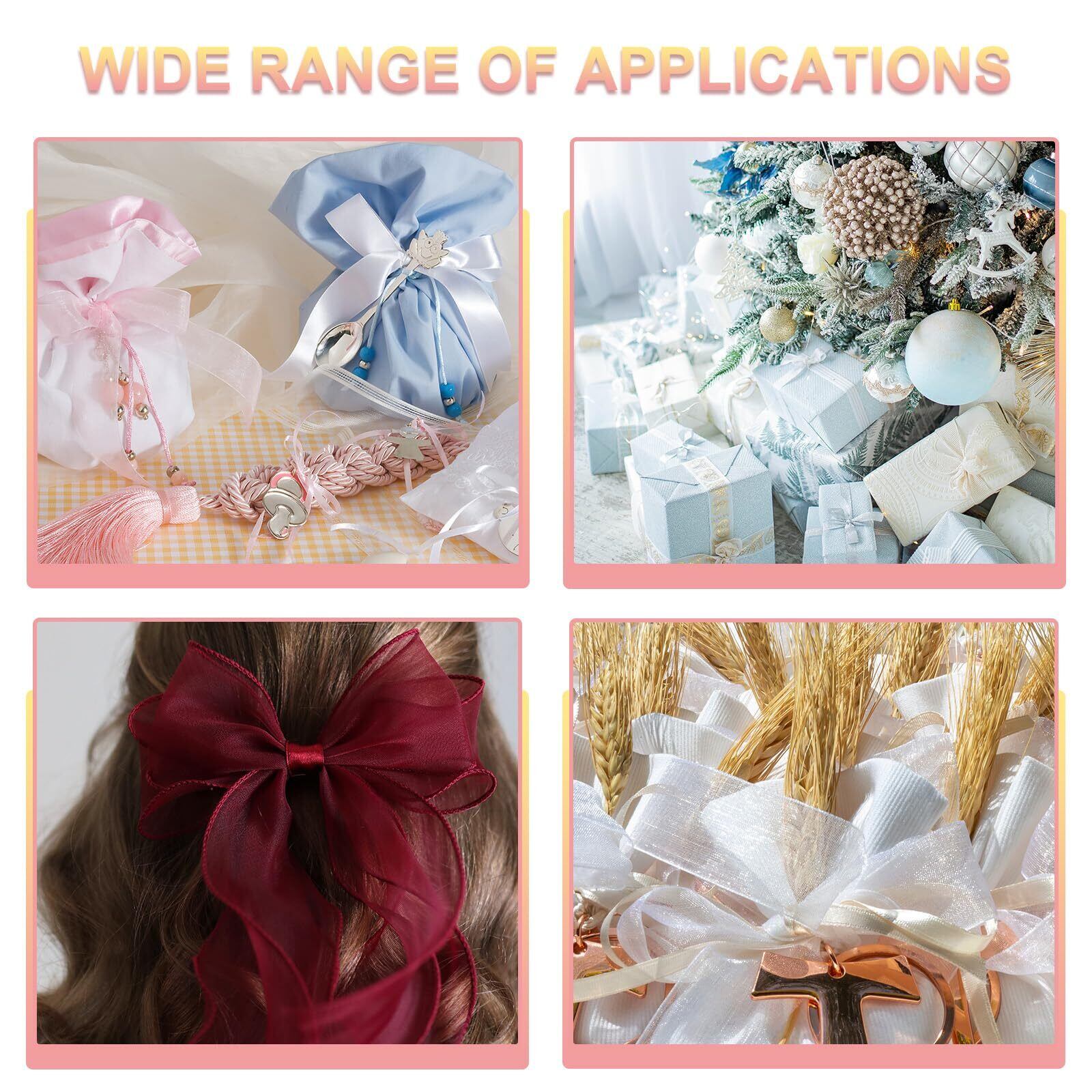 応用: オーガンジーリボンは独特で目を引く外観を持っています。ギフトラッピング、ウェディングデコレーション、ブーケデザイン、ホリデーパーティーデコレーション、花のアレンジメント、縫製、その他のDIYハンドクラフトに最適です。