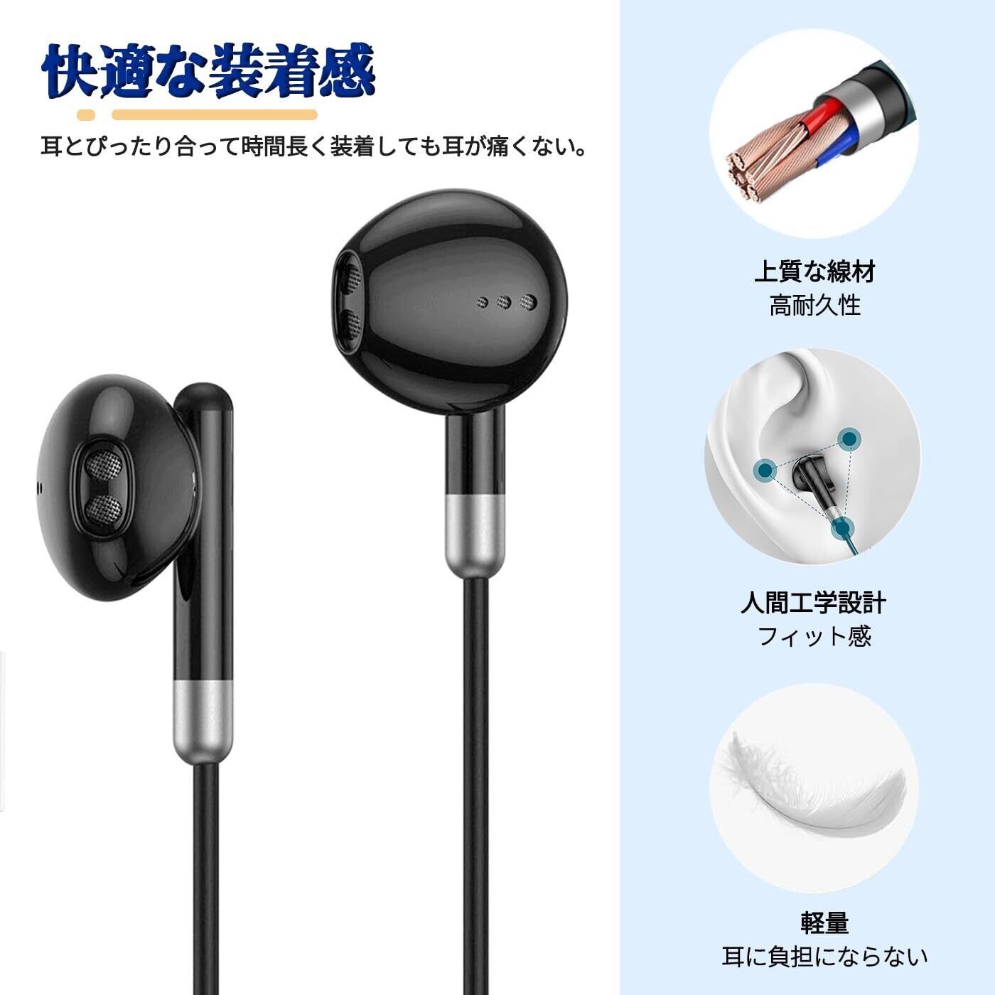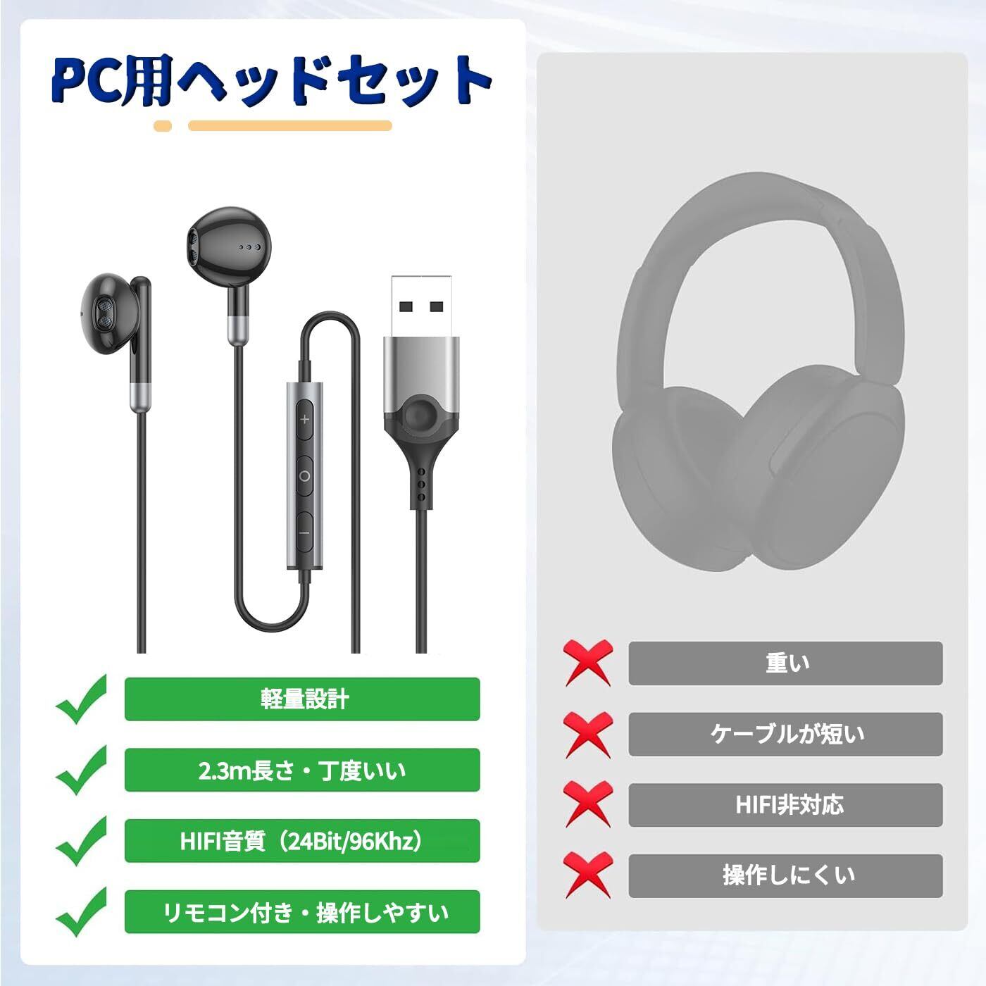 【快適な装着感・丁度いい長さ2.3m】耳の形状に基づいて人間工学によるデザインを採用しており、耳とぴったり合っていて時間長く装着しても耳が痛くなくて、周りのノイズも最大限に減らします。ケーブルは長さが2.3mあるので、机の下にあるコンピューターのUSBポートやテレビの後ろにあるUSBポートとの接続も悠々です。ご注意:音割れや接触不良を避けるために、イヤホンのコネクタを設備のUSBポートの最後までに差し込んでください。