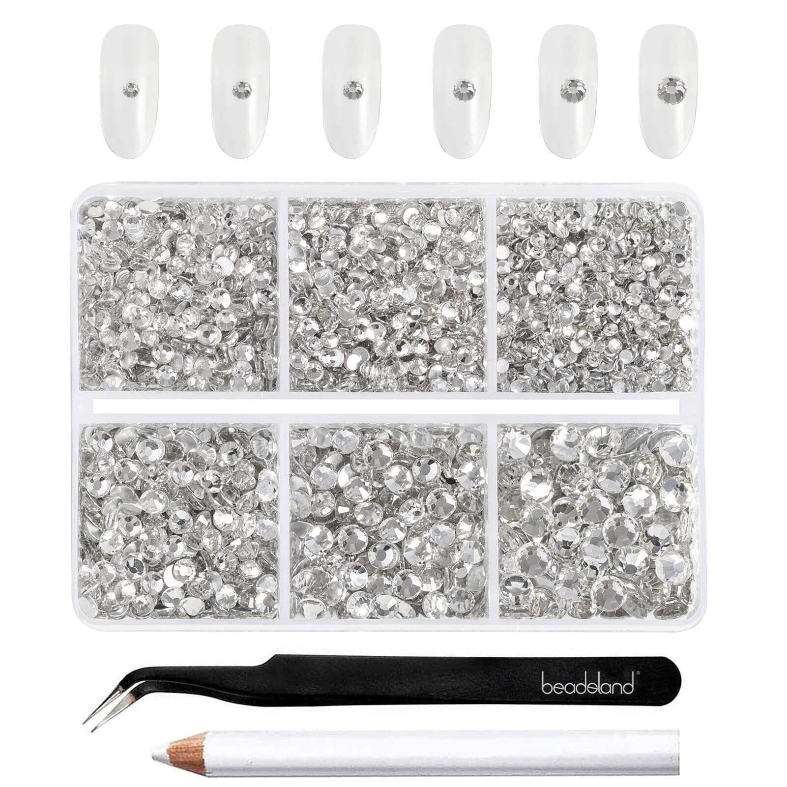 Beadsland(ビーズランド)4,300個 フラットバック ラインストーン ホワイトのラインストーン ネイル用ジェム ラウンド クリスタルラインストーン 手工芸用 6サイズ混合 ピンセットとワックスペンシルキット付き、SS6-SS20、クリスタル