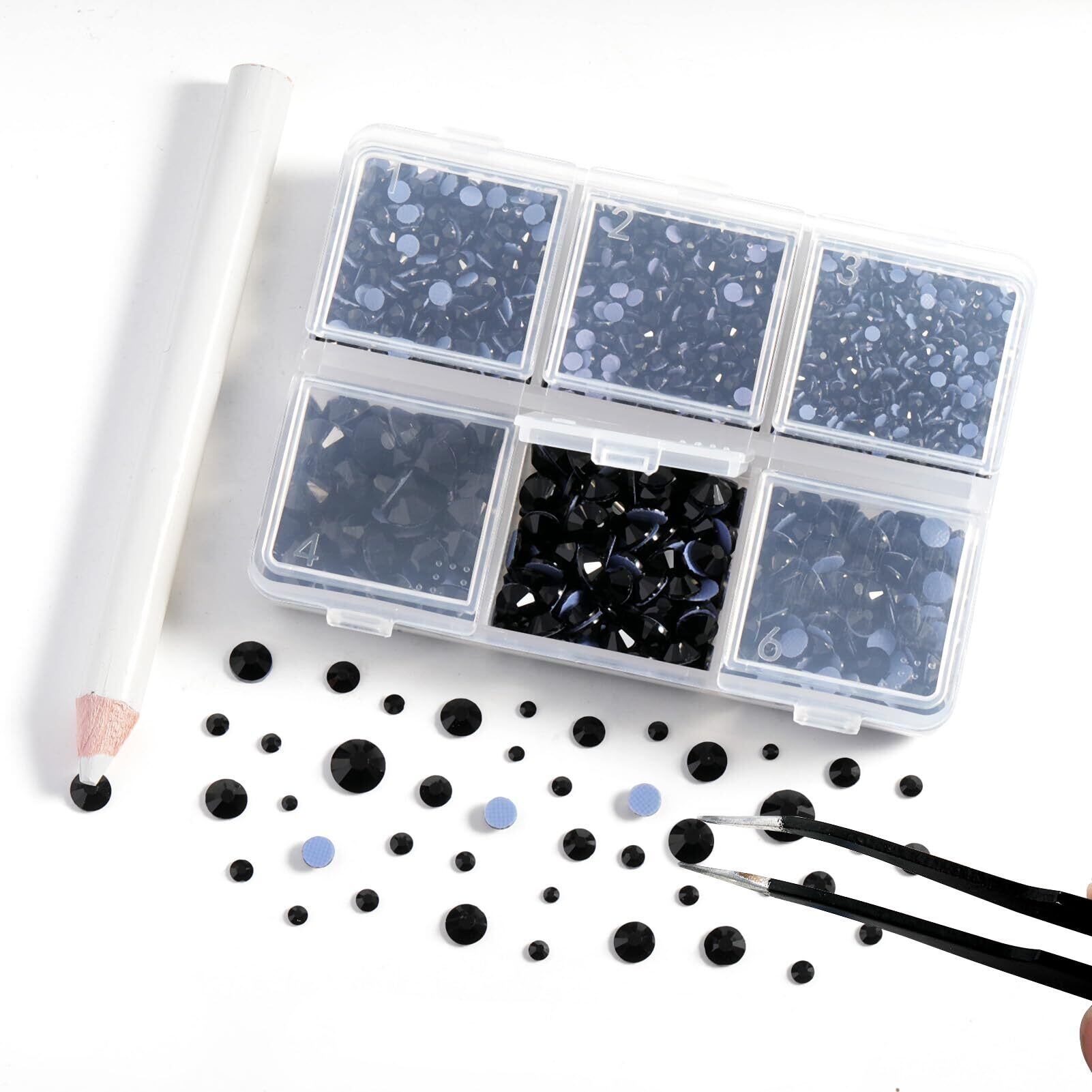 このブラックホットフィックス ラインストーン キットには、6サイズの衣類用のアイロン接着ラインストーンが計4,000個、ピンセット1個、ワックスペンシル1本が含まれています。