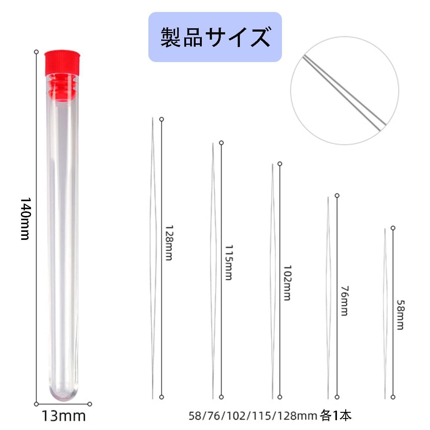 【セット内容】:セットには5種類のサイズの針具が含まれており、それぞれ5.8センチ、7.6センチ、10.2センチ、11.5センチ、12.8センチの各1本、計5本。コンパクトで透明な収納ボトルが付属しており、出し入れや出し入れが容易で、工具の収納がより整然としています。