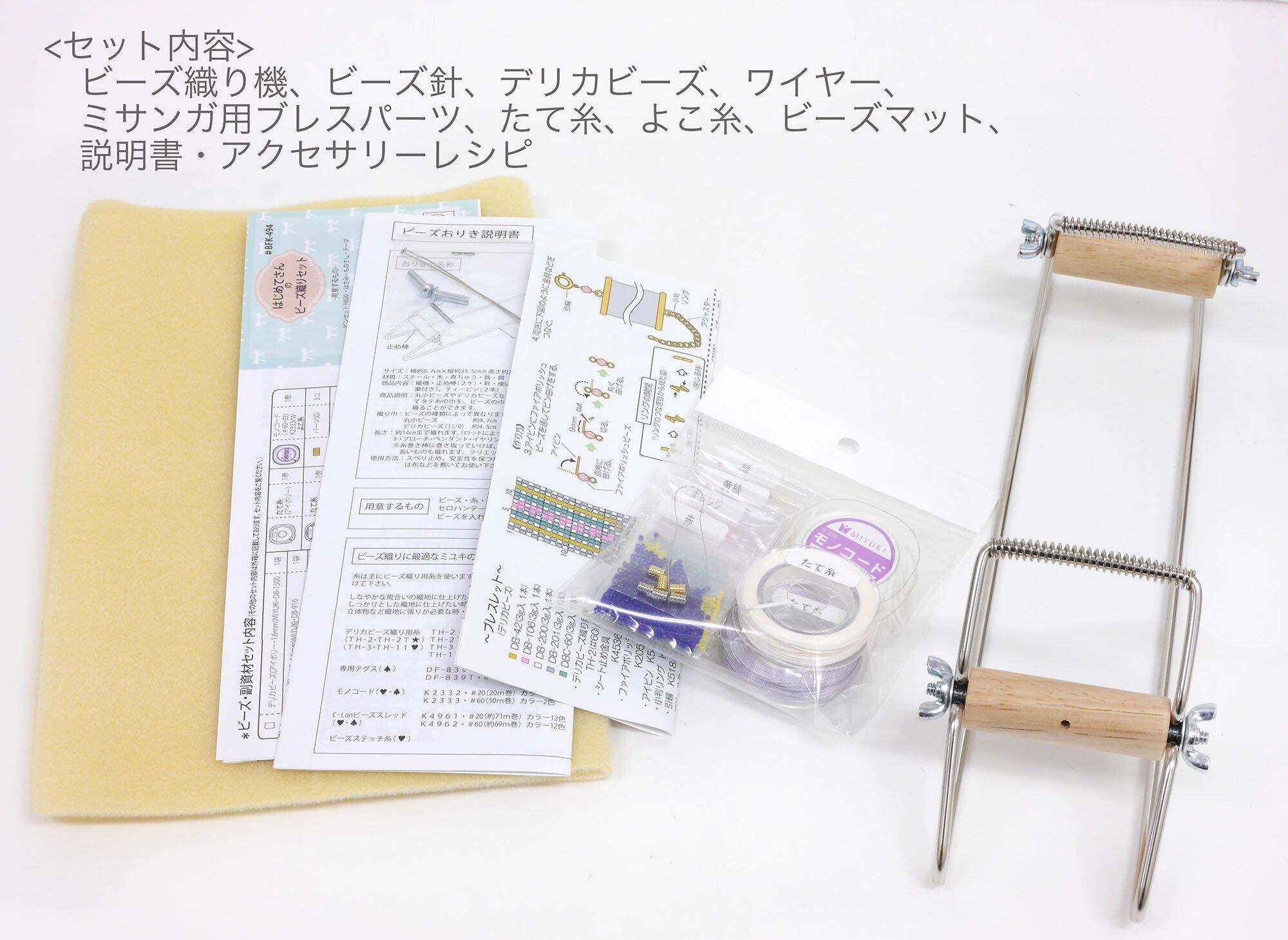 セット内容:ビーズ織り機、ビーズ針、デリカビーズ、ワイヤー、ミサンガブレス用パーツ、たて糸、横糸、ビーズマット、説明書・アクセサリーレシピ
