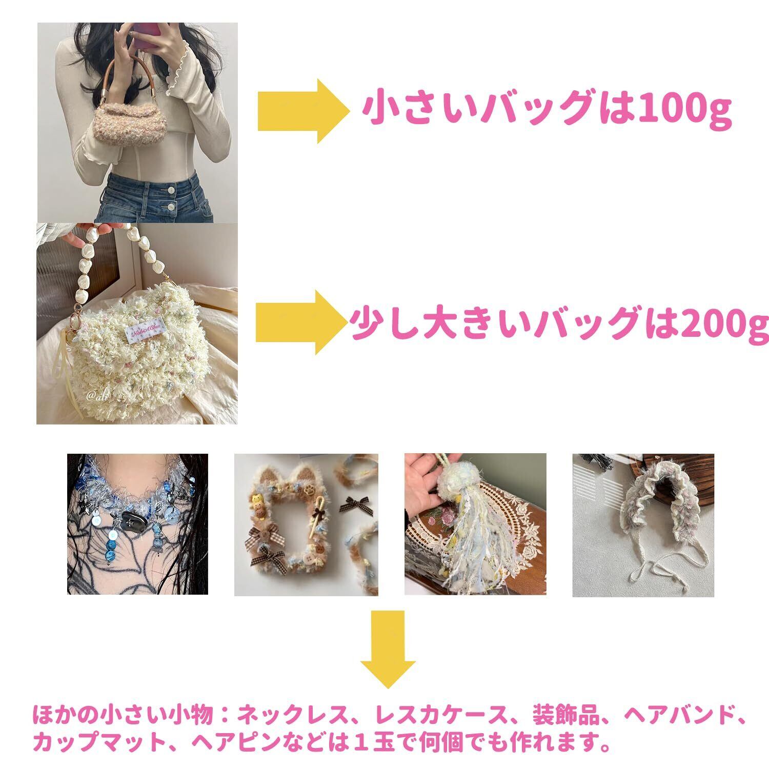 用量の意見:マフラを編む場合:300-400g。バッグを編む場合:100-200g、バッグのサイズによって決めることができます。小さなアイテムは通常100gでいいです。サイズの測り方はスタッフ間で統一しておりますが、若干の誤差(±10g)が生じる場合がございます。