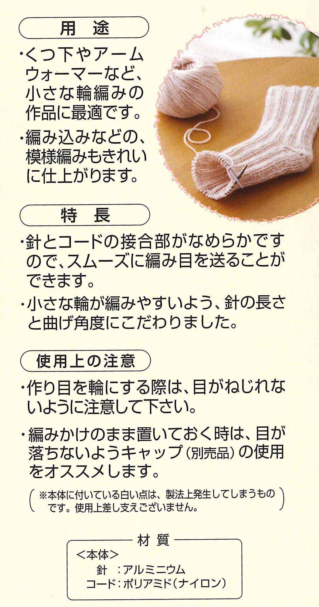 靴下やアームウォーマーなそ、小さな輪編みの作品に最適な輪針。編込みや模様編みもきれいに仕上がる。