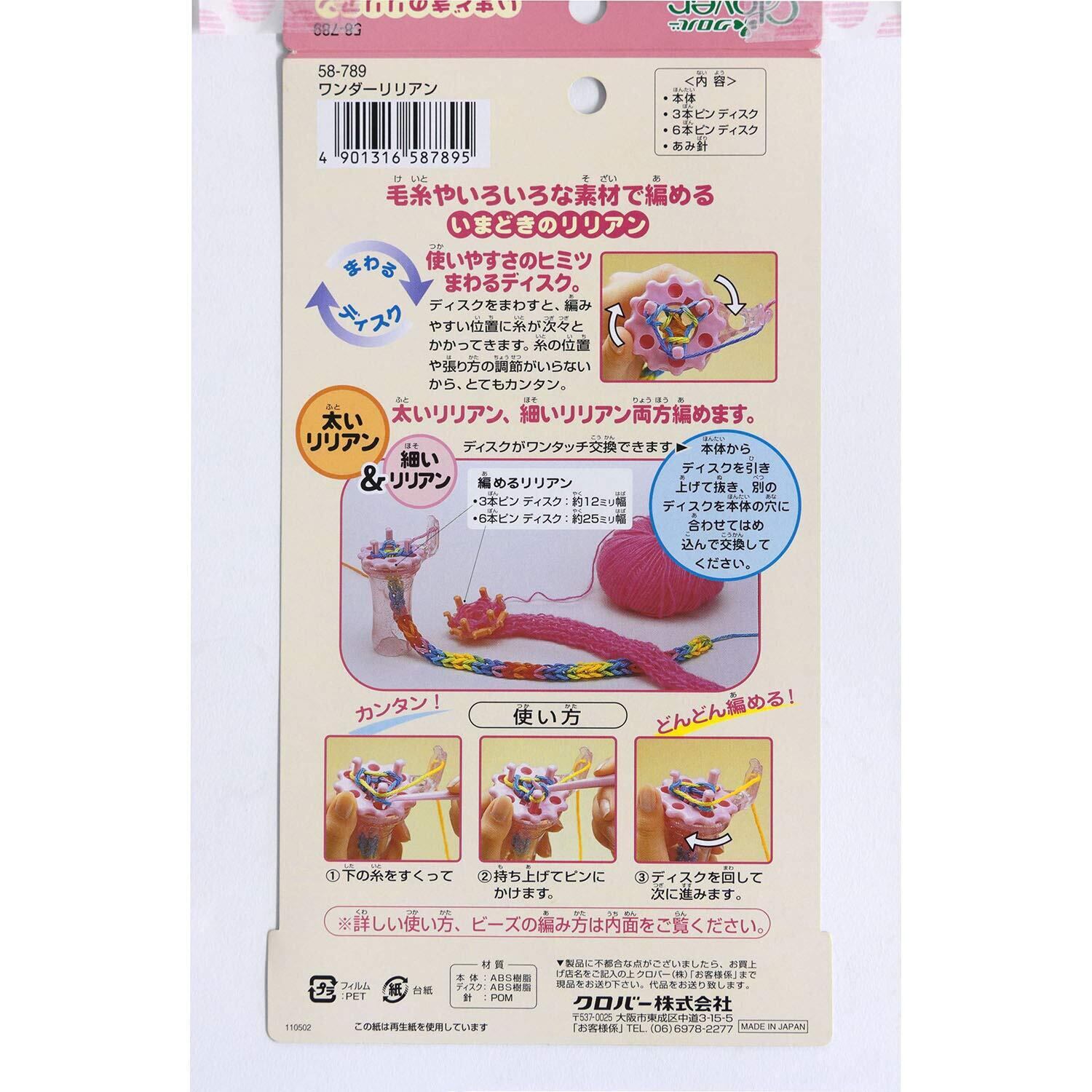 細いリリアンは3本ピン、太いリリアンは6本ピンとディスクをワンタッチで交換することで2種類の太さのリリアンが編めます。
