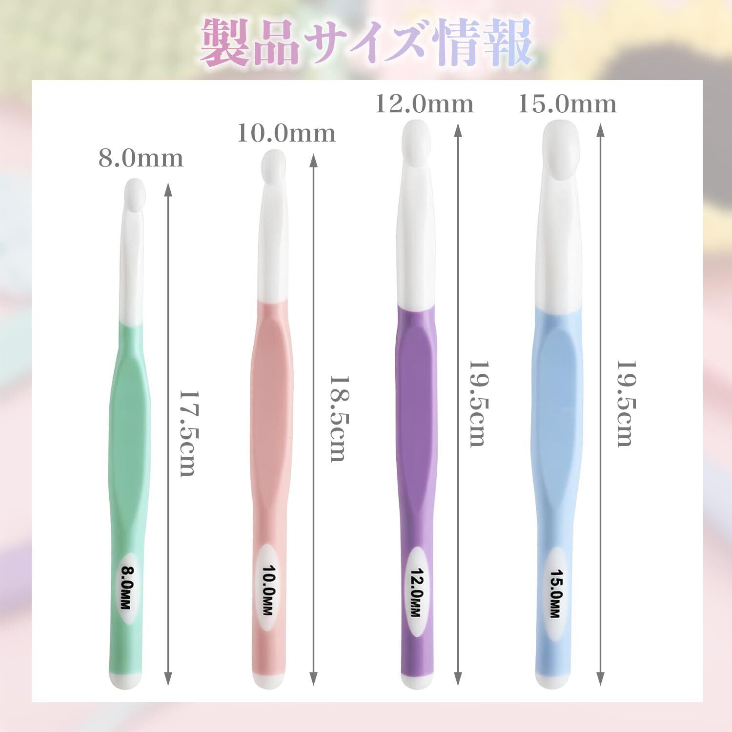 【4サイズセットで幅広いニーズに対応】8mm、10mm、12mm、15mmの4サイズのかぎ針をセットでご提供。明るいカラーとハンドルに印字されたサイズ表示で、簡単に区別でき、初心者でも使いやすい設計です。