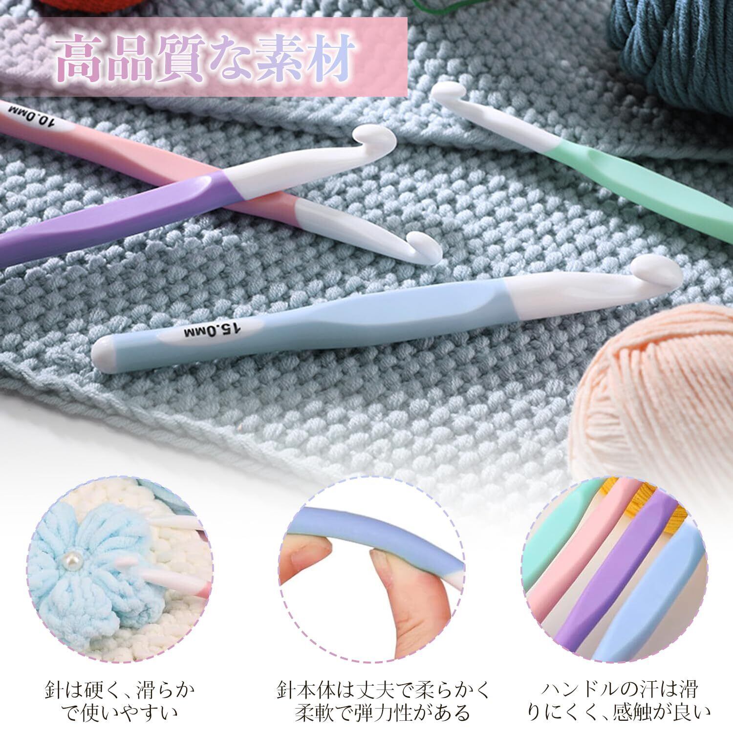 【滑らかで使いやすいABSフック】かぎ針の先端は滑らかで丸みを帯びたABS素材を使用。糸が引っかかりにくく、編み物がスムーズに進みます。軽量で耐久性があり、長く愛用できる品質です。