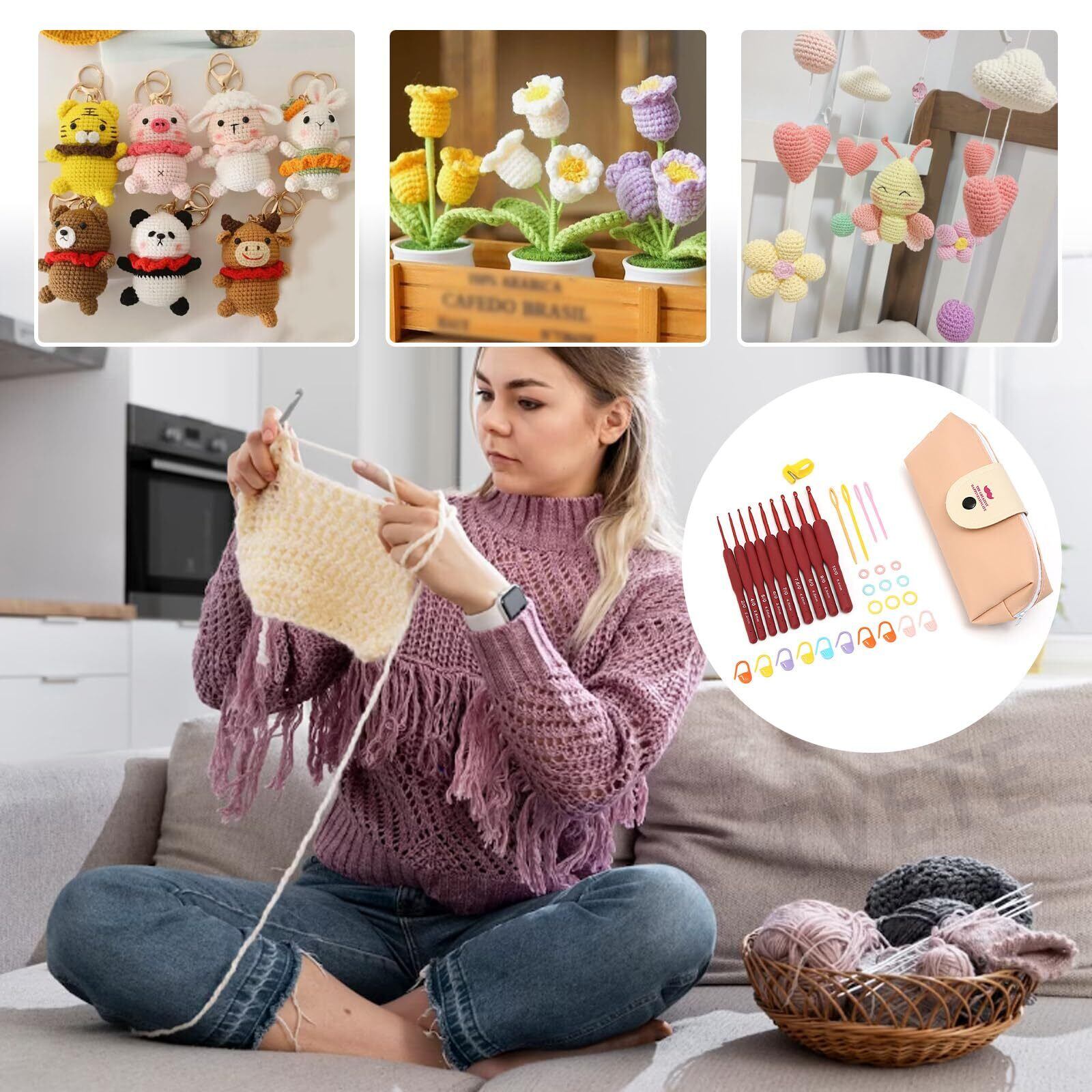 【編みを始めましょう! 】: 編み物かぎ針キットには、さまざまな編み物作成のニーズを満たすために、高品質のかぎ針とさまざまな補助ツールが組み合わされています。初心者でも、経験豊富な手工芸の専門家でも、簡単に始めて自分だけのユニークな作品を編むことができます。自分だけの温もりと美しさを編み出して、人生の芸術を咲かせましょう。