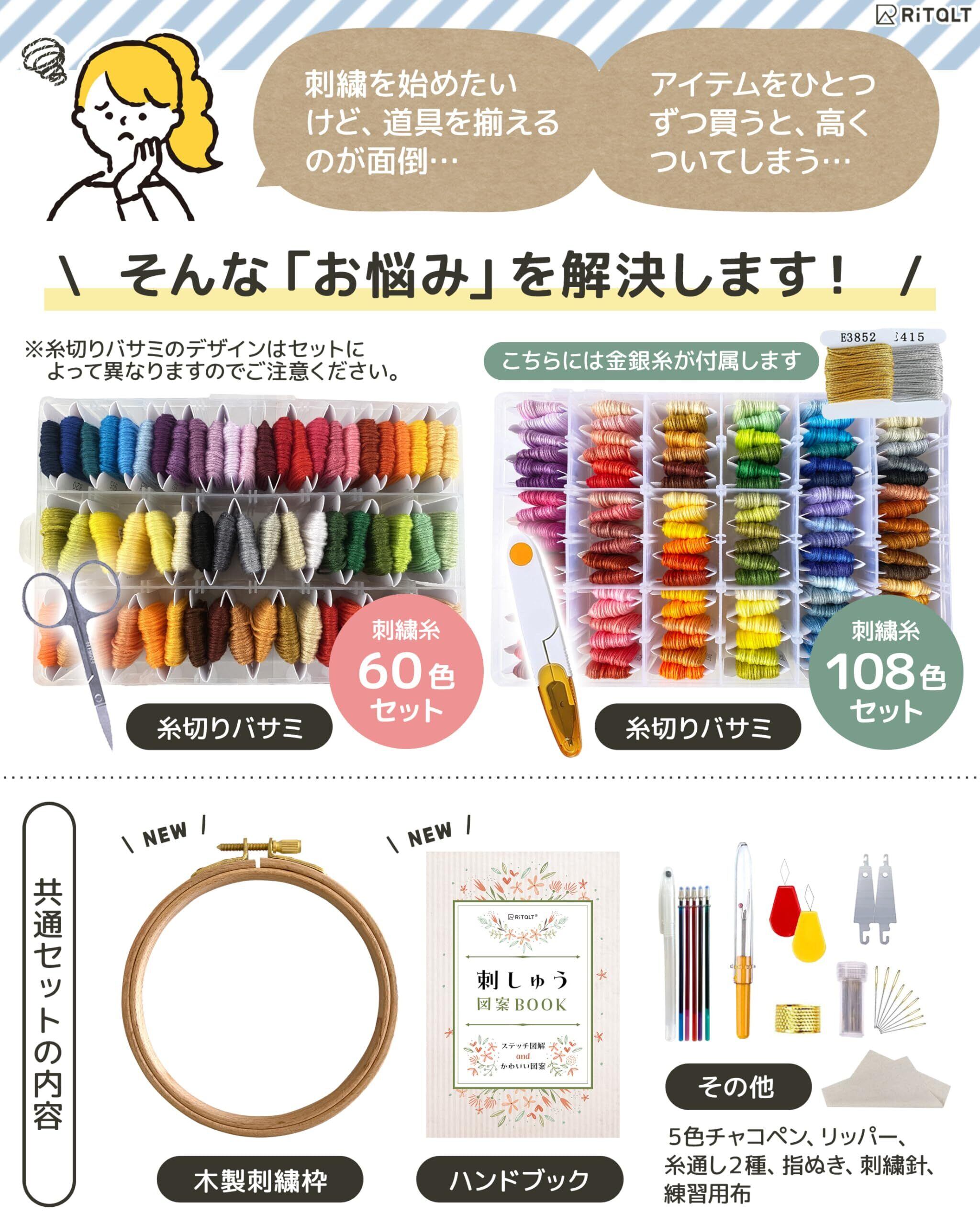 【商品仕様】○セット内容:刺繍糸(60色/108色)、刺繍枠、糸切りばさみ、刺繍針、糸通し、リッパー、指ぬき、チャコペン5色、ハンドブック、布 ○カラー:60色/108色 ○重量:《60色》350g/《108色》750g ○ブランド:RITALT(登録 第6356488号)は、安心・安全の日本ブランドです。