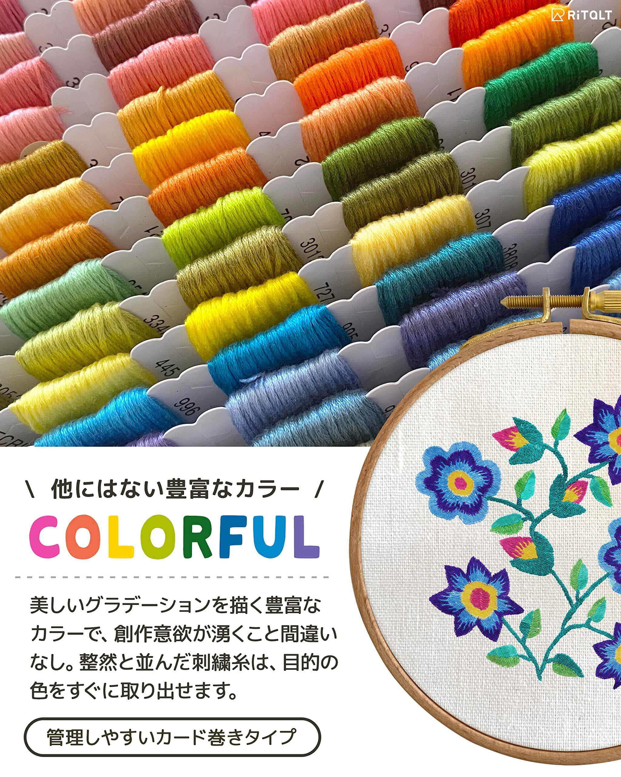 【豊富なカラー】美しいグラデーションを描く豊富なカラーで、創作意欲が湧くこと間違いなし。整然と並んだ刺繍糸は、目的の色をすぐに取り出せます。刺繍糸は管理しやすいカード巻きタイプ。