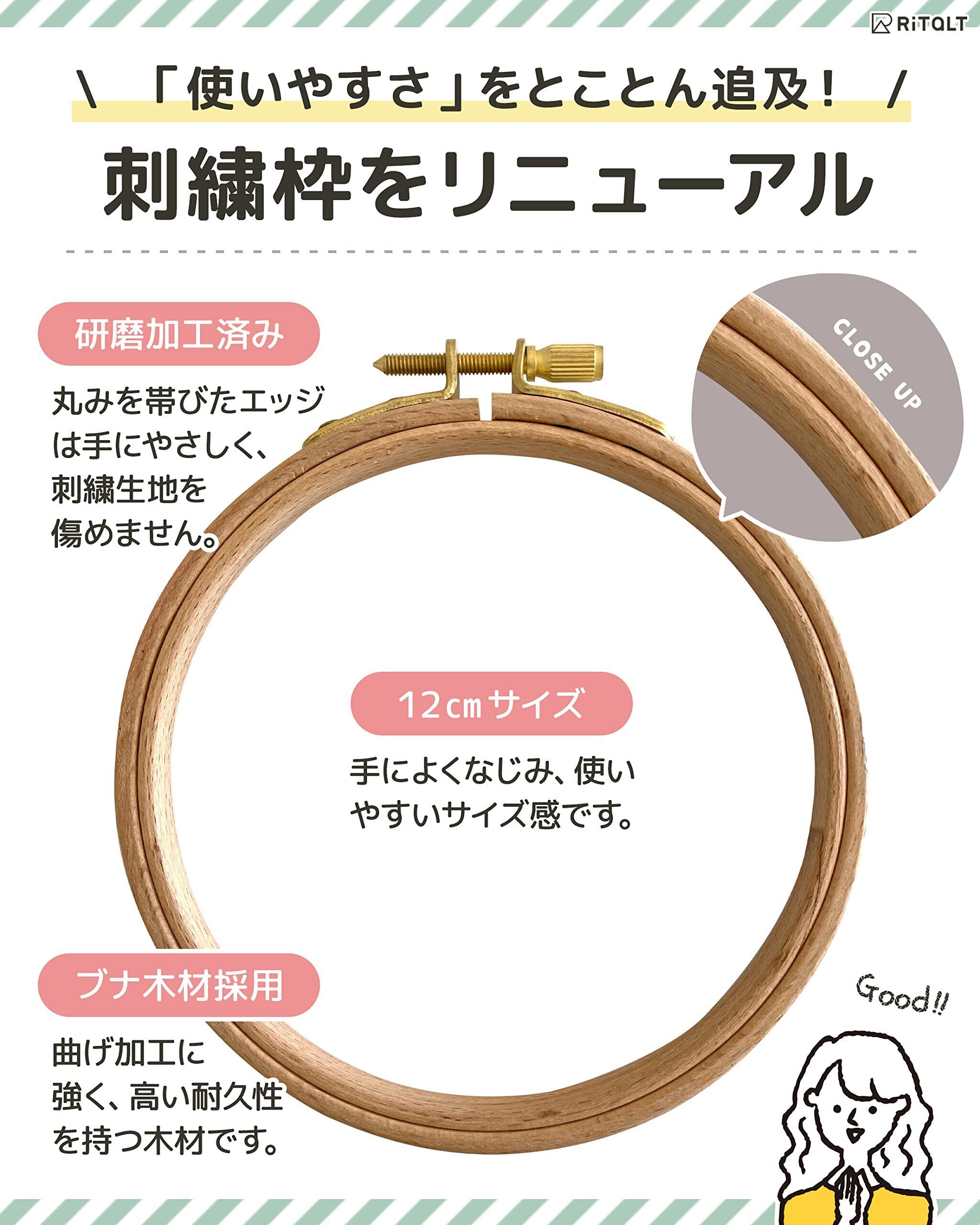 【刺繍枠をリニューアル】《研磨加工済み》丸みを帯びたエッジは手にやさしく、刺繍生地を傷めません。《12cmサイズ》手によくなじみ、使いやすいサイズ感です。《ブナ木材採用》曲げ加工に強く、高い耐久性を持つ木材です。