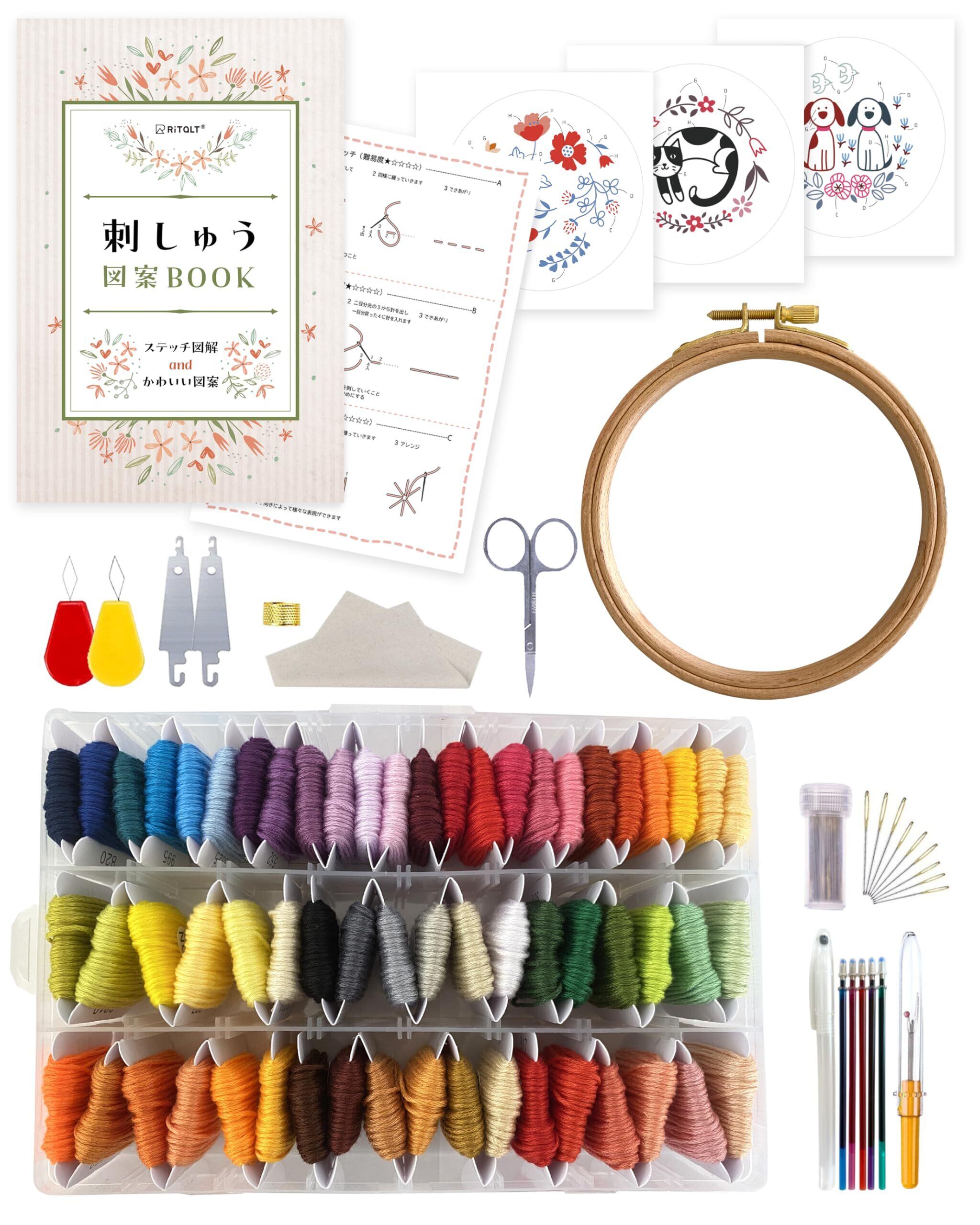 RITALT 刺繍キット 刺繍糸 60色 図案本 刺繍枠 初心者 セット 収納 布 【25番/8m/6本綴り】
