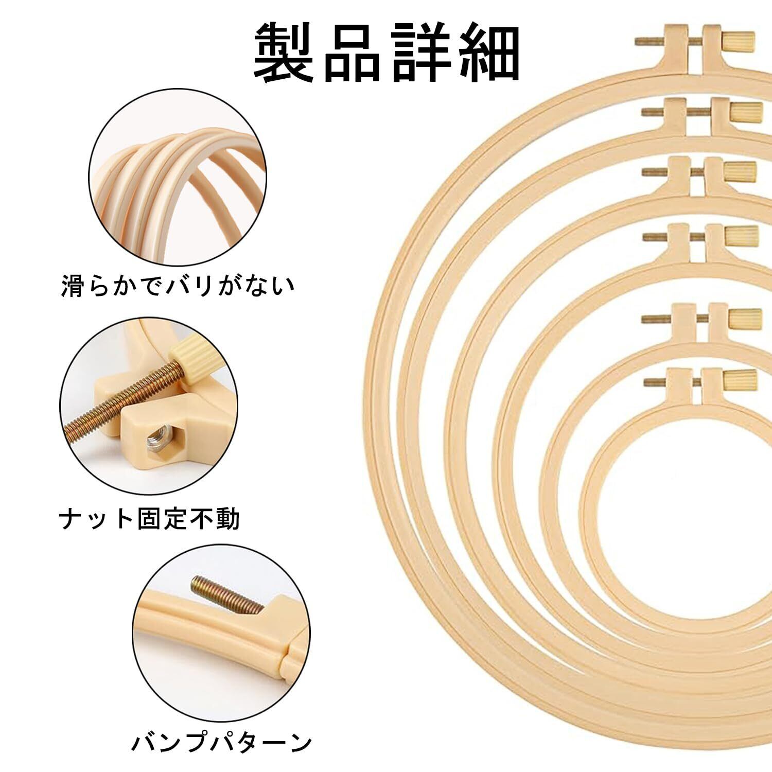 【製品仕様】刺繍リングは6個セットで、それぞれ異なるサイズがあります。直径はそれぞれ:9.5cm、12.5cm、16.5cm、20cm、24cm、27cm。材質:プラスチック。