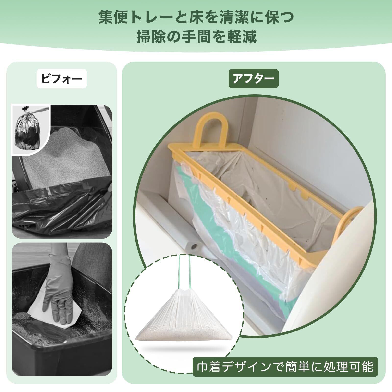 袋のサイズは 幅55cm × 奥行45cm。集便トレーの⻑さと幅の合計が52cm以下、奥行が20cm以下の自動猫トイレにおすすめです。