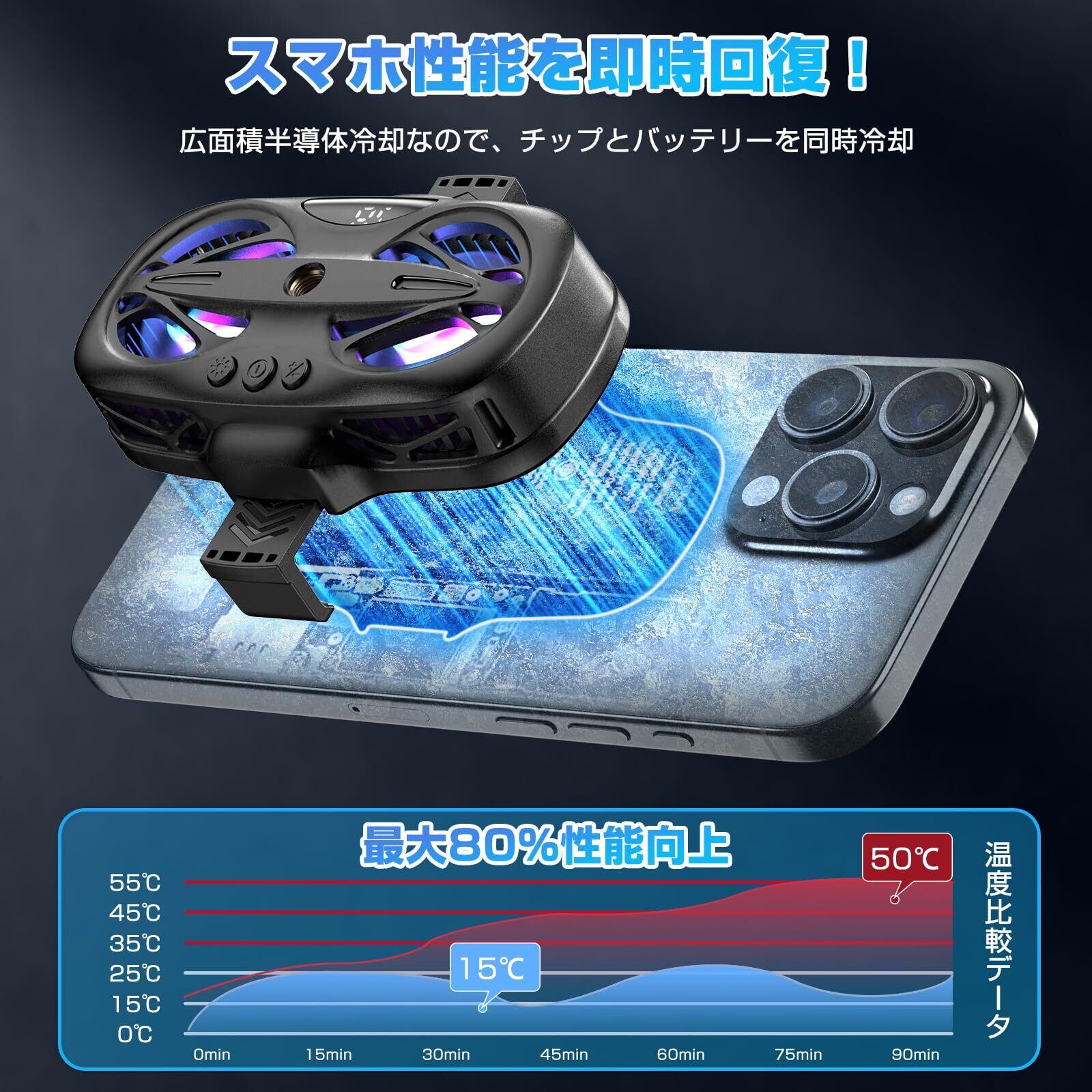 【スマホ熱暴走の救世主|3秒急速冷却】 最新半導体冷却チップを採用したハイテク冷却システムで、わずか3秒でスマホの高温状態を解消。従来比200%の冷却効率を実現し、4K動画撮影や長時間ライブ配信中でもスマホの熱暴走を完全にブロック。独自開発のマルチポイント冷却技術により、スマホのCPUチップとバッテリー領域を同時に効率的に冷却。これによりスマホの性能低下やフレーム落ち、突然のフリーズや強制終了といったトラブルを根本から防止します。
