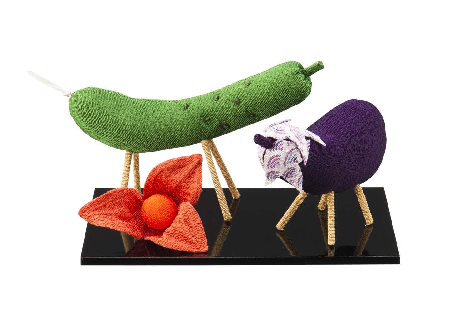 旧来はきゅうりを馬、なすを牛に見立てて割りばしなどで足を作って飾っていましたが、夏場の暑さで野菜が痛むことや、捨ててしまう生ものではなく毎年使用できるものがないかといったご要望に応え、ちりめん製の商品をご用意しました。